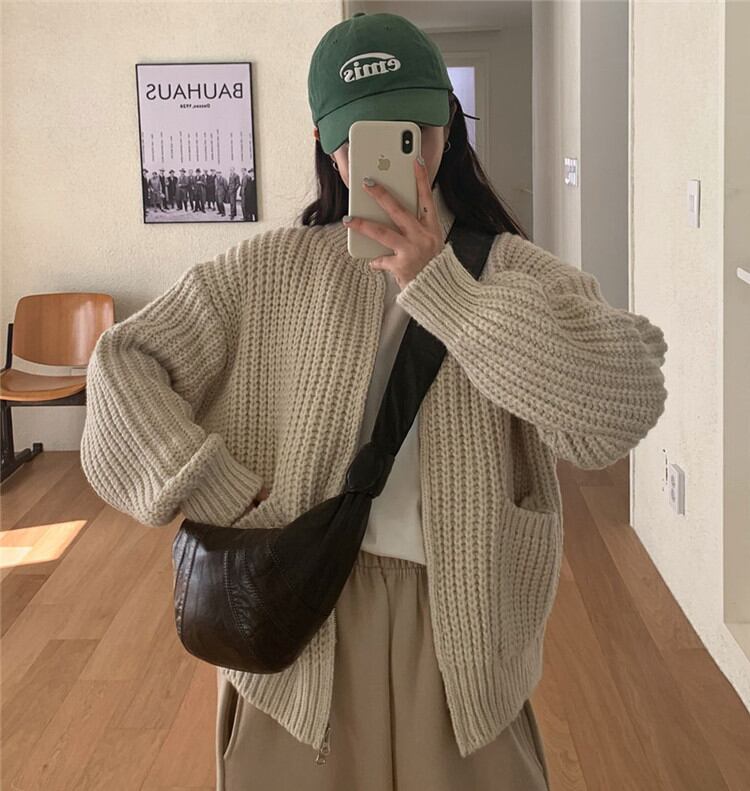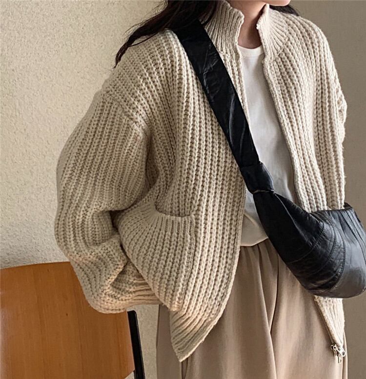 暖かい 厚手 ジッパー ニット セーター カーディガン スタジャン コート カジュアル ピュアカラー