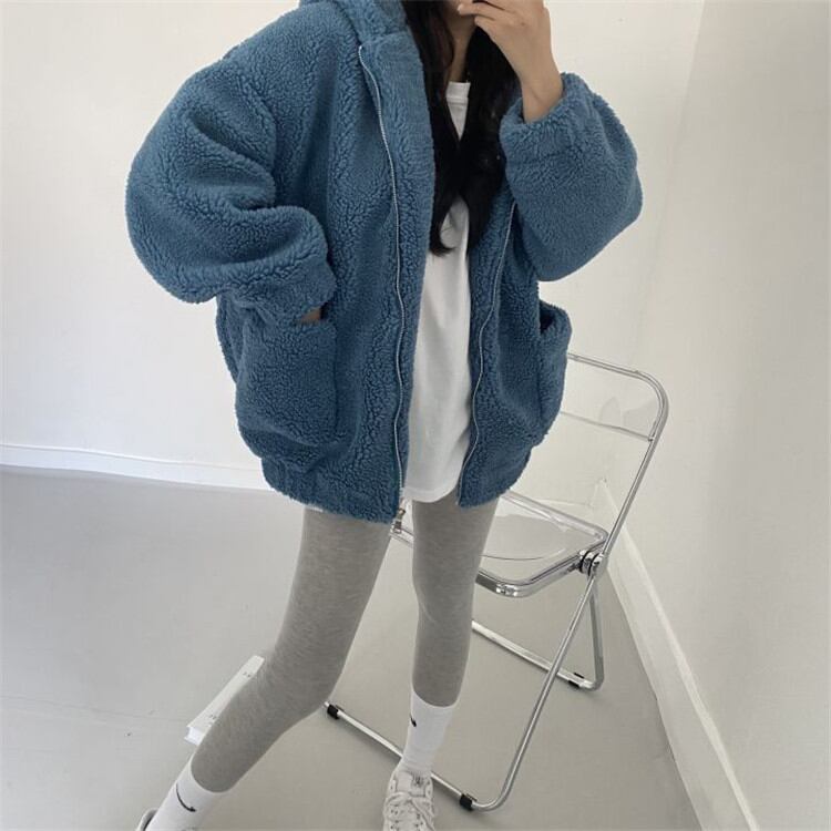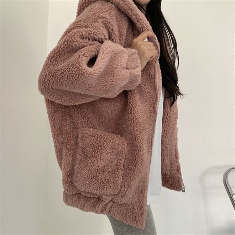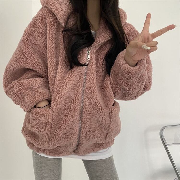 可愛い 暖かい 厚手 子羊の毛 フード付き コート ゆったりする カジュアル 柔らかい ピュアカラー