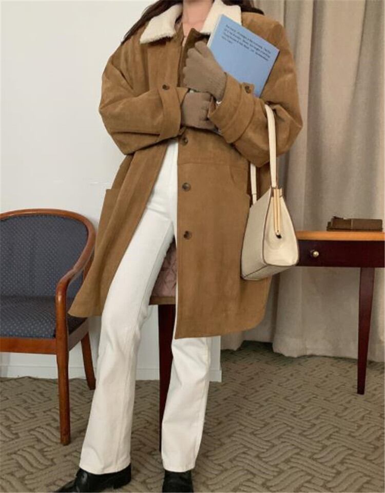 ラーマッチング 子羊の毛 中・長セクション コットン 暖かい 厚手 ゆったりする スエード コート 女性