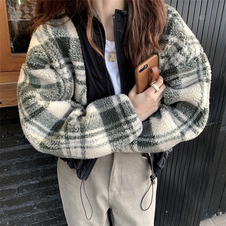 ◎【送料無料】オシャレ度UP チェック柄 縫付 子羊の毛 短いスタイル コート 女性 ヤングスタイル カジュアル