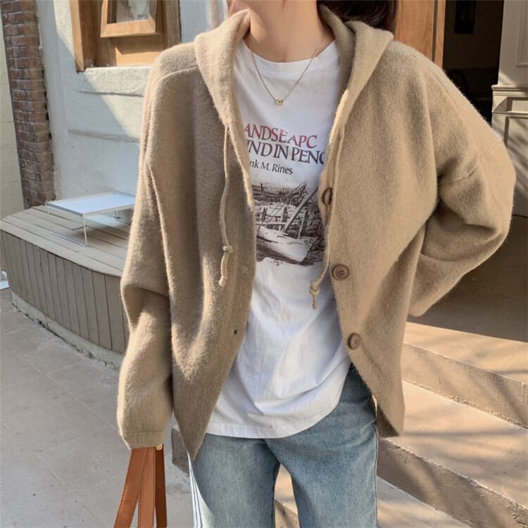 ニット セーター カーディガン コート ヤングスタイル 大人気 フード付き ピュアカラー