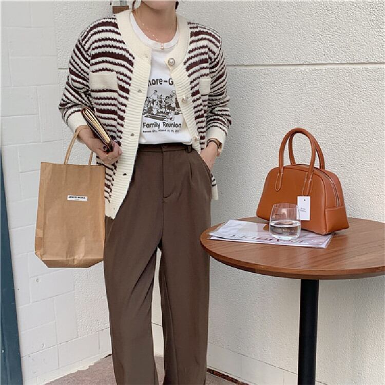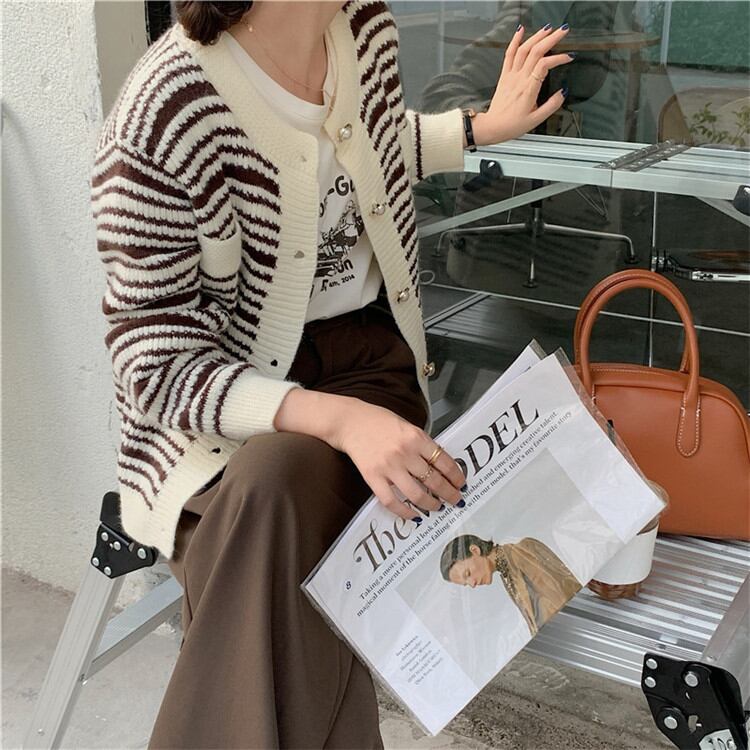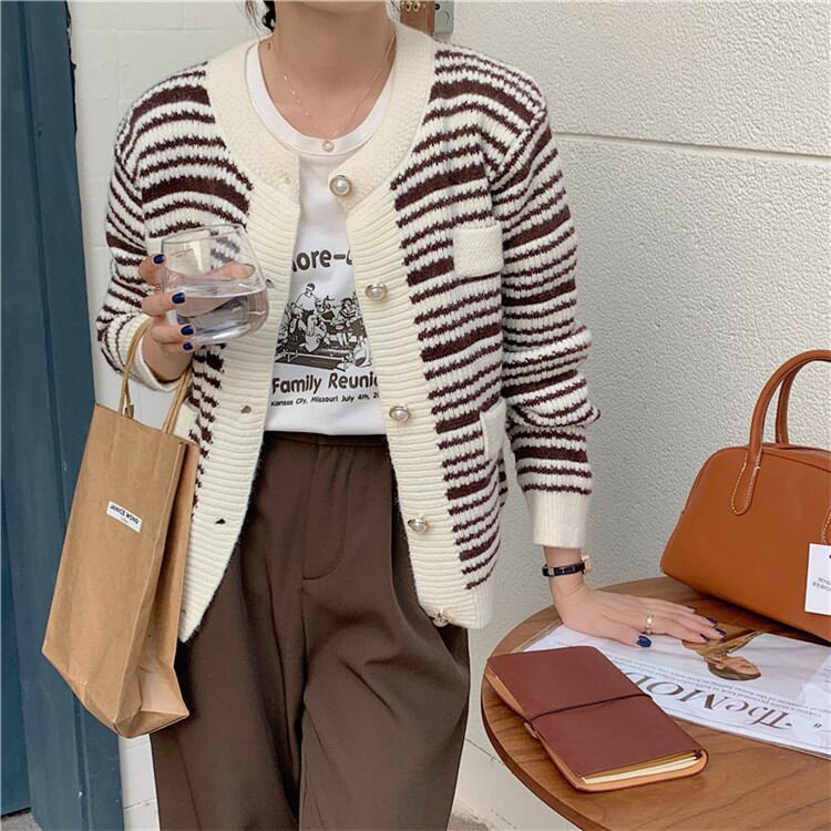 秋の新作 レトロ 真珠 ボタン ストライプ 長袖 スリム セーター コート