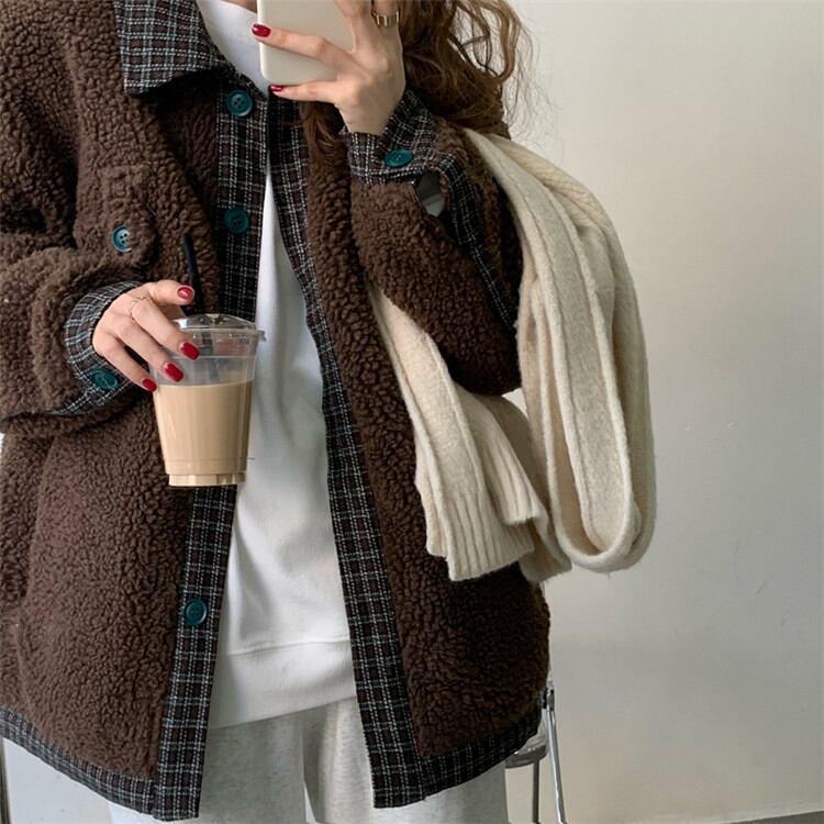 フェイク2ピース 子羊の毛 レトロ 格子縞 コート 縫付 厚手 暖かさ