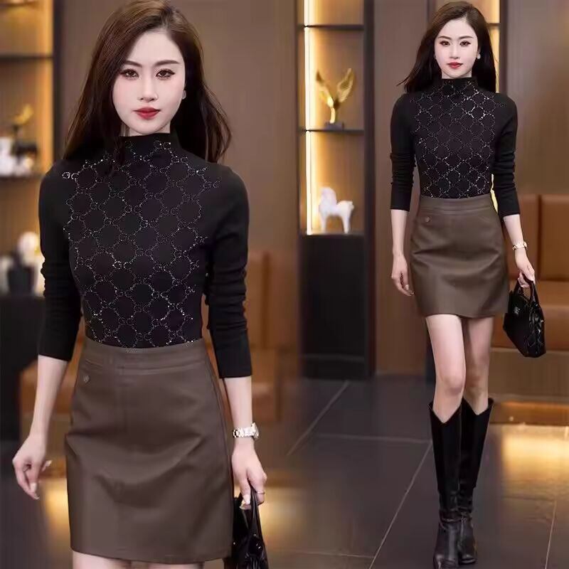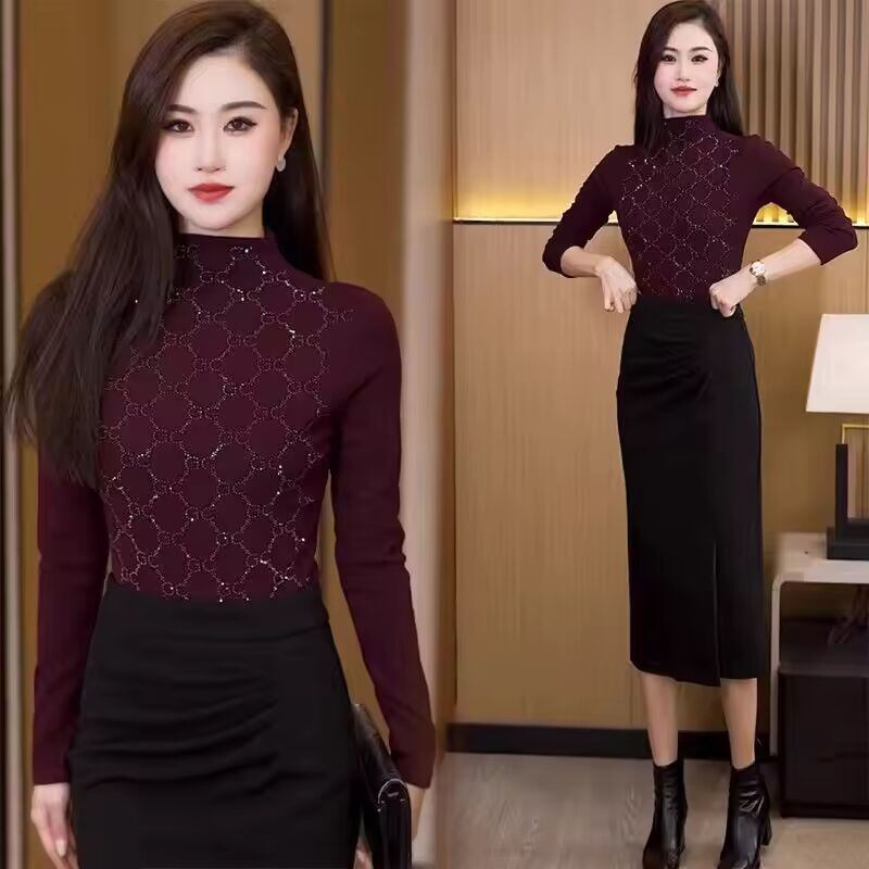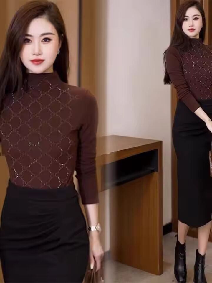【送料無料◎】 おしゃれな厚手秋冬ハーフハイカラー女性用ベースシャツ両面ベルベットレーストリムシフォンブラウス
