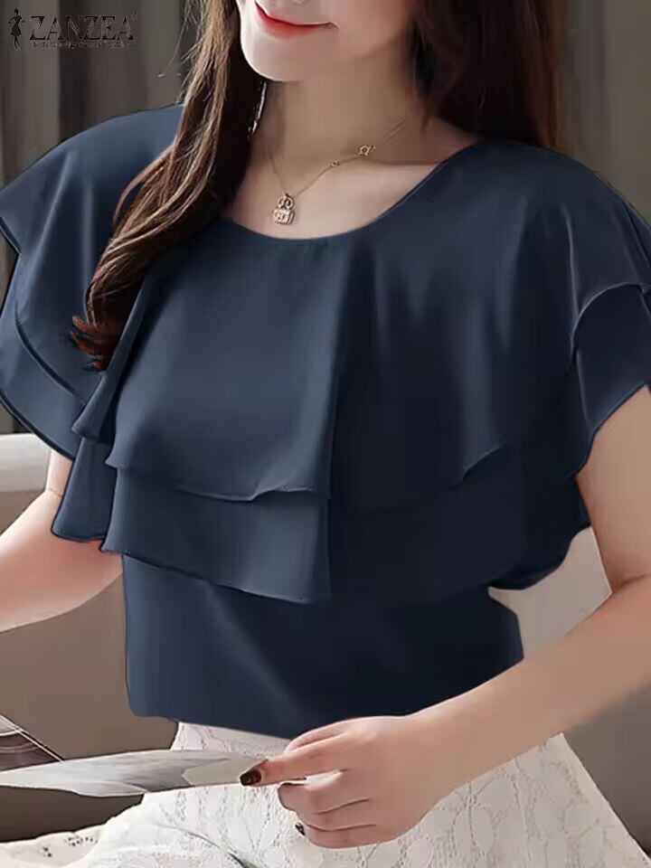【送料無料◎】 ZANZEA 2025 女性シャツヴィンテージラウンドネック半袖ブラウスファッションダブルフリル Blusas カジュアルプリーツ固体トップスファム