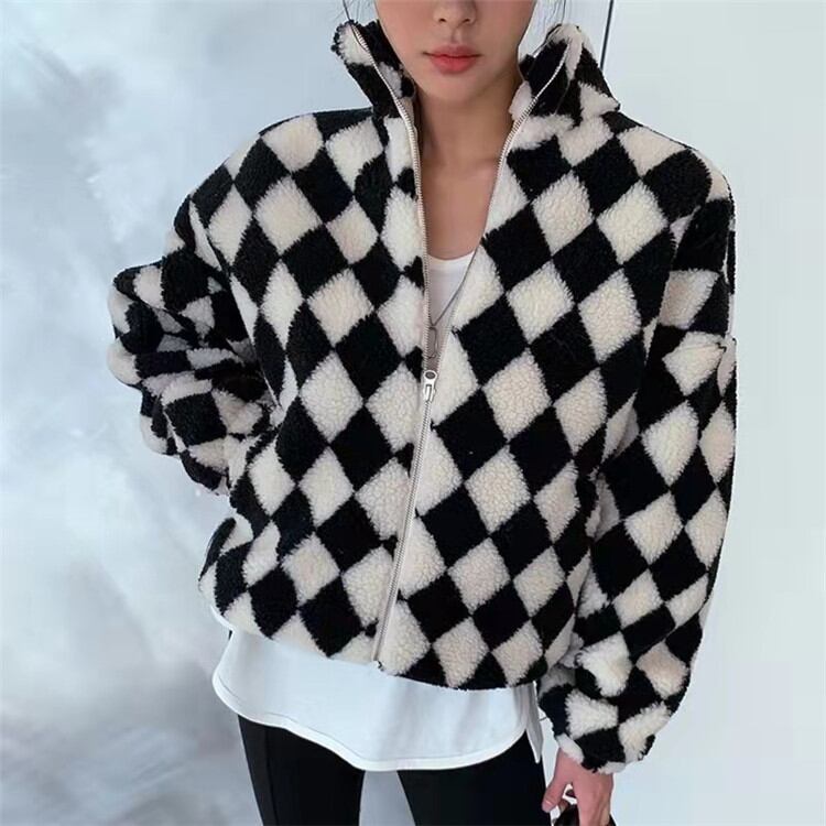 チェック柄 カラーマッチング スタンドカラー ジッパー 子羊の毛 コート 女性 タイド