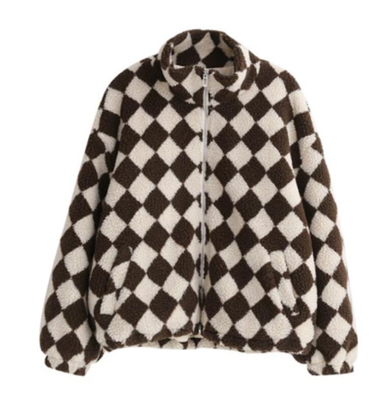 ◎【送料無料】緊急タイムセール ファッション チェック柄 カラーマッチング スタンドカラー ジッパー 子羊の毛