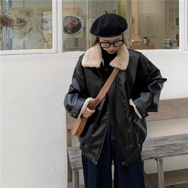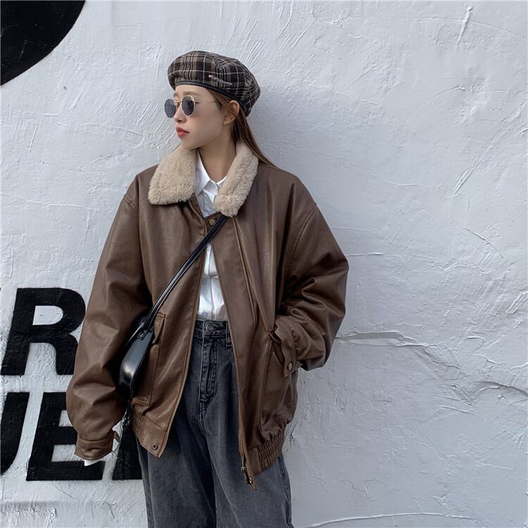 ◎【送料無料】韓国ファッション レトロ INS ぬいぐるみ 革のジャケット百掛け ジャケットフライドストリートコート