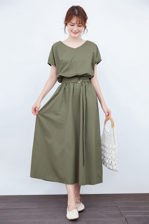 ◎【送料無料】ロング丈ワンピース マキシワンピース Vネック ベルト付き 体型カバー オーバーサイズ カジュアル