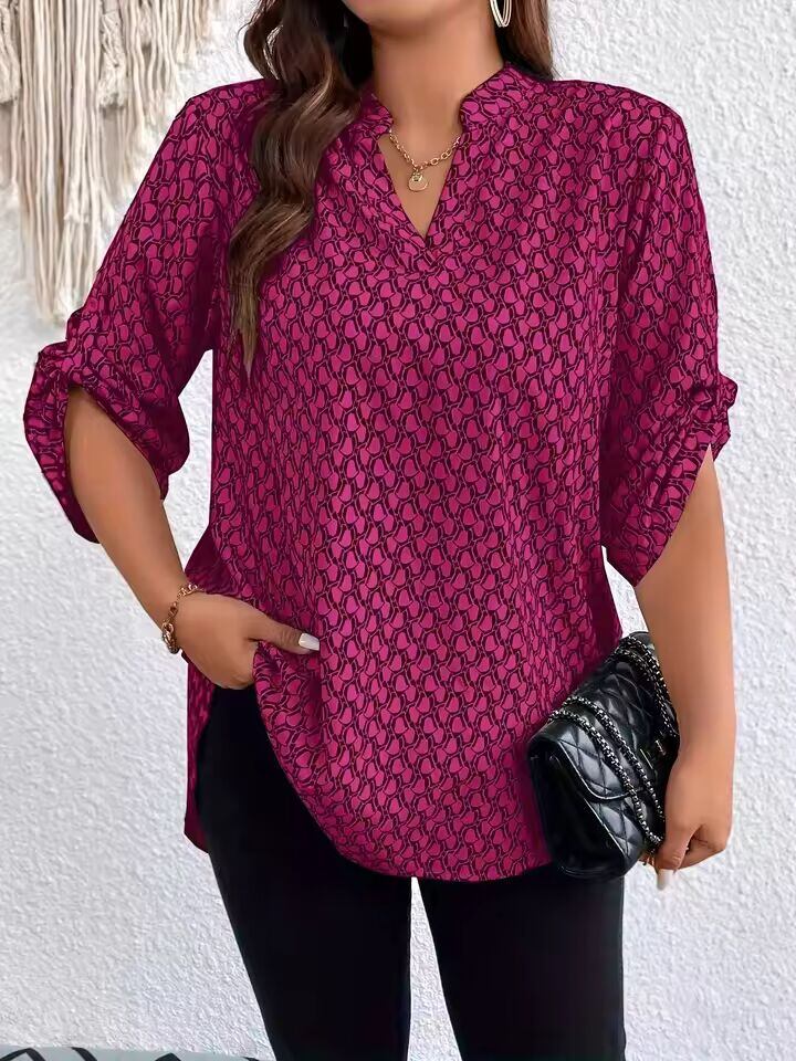 【送料無料◎】 女性用プリントVネックシャツ、ロールエッジスリーブ、カジュアルトップ、プラスサイズ、1xl-5xl
