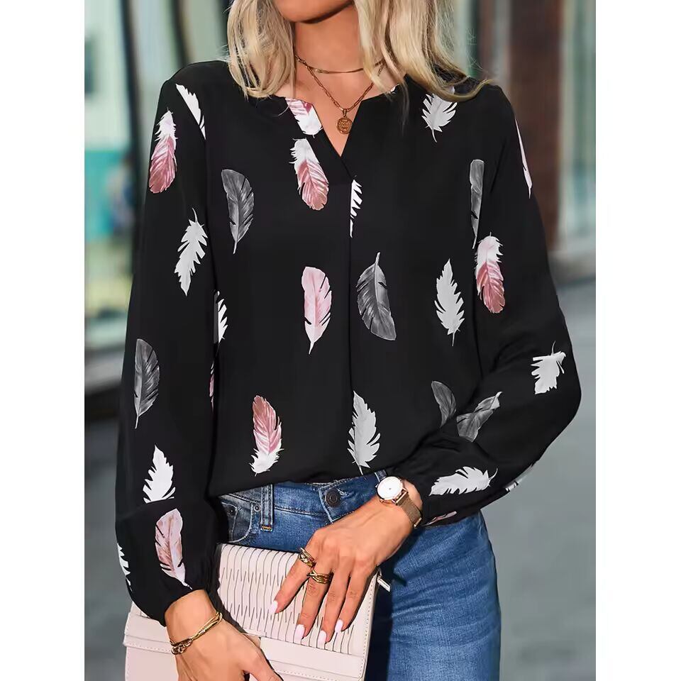 【送料無料◎】 2024 春夏の新作女性カジュアル Tシャツファッションフェザープリント長袖 V ネックルーズブラウストップス女性プルオーバー Tシャツ