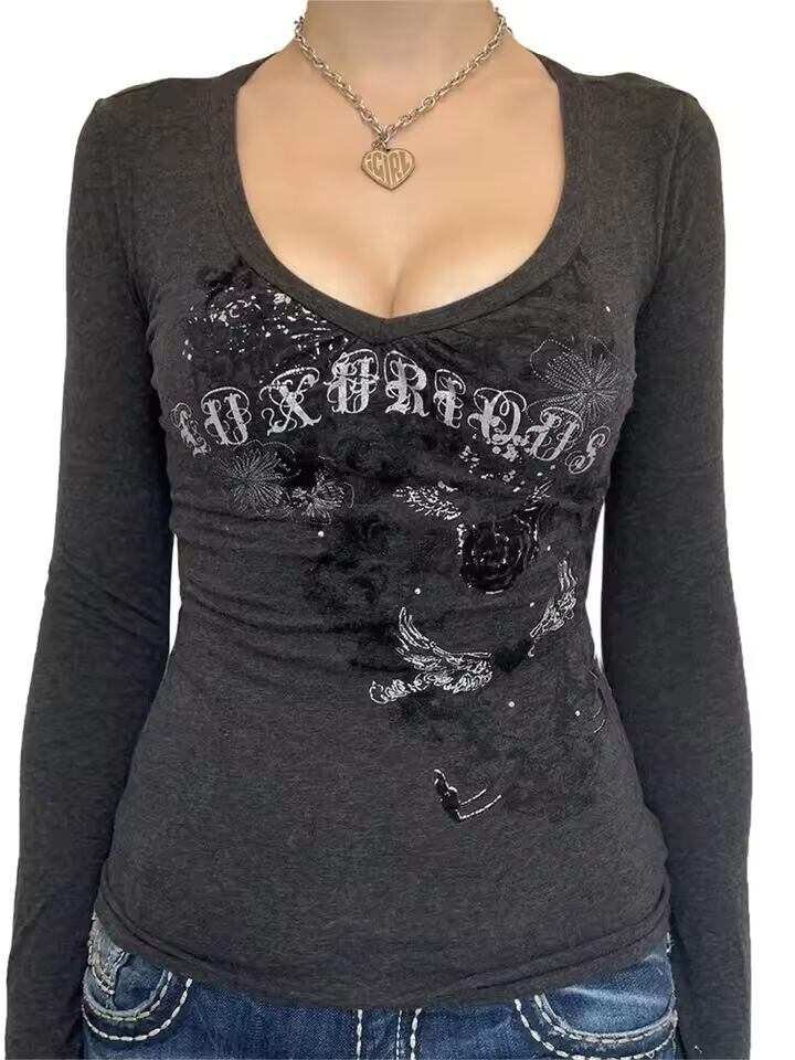 【送料無料◎】 女性用長袖ゴシックプリントTシャツ,パンクグランジTシャツ,美的Tシャツ,春,秋,グラフィック,y2k