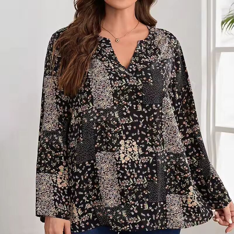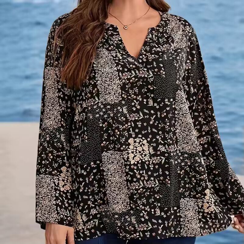 【送料無料◎】 プラスサイズのレディースシャツ、プリントVネック長袖、ルーズフィット、エレガントなデザイン、春と秋のファッショナブルなカジュアルバケーショントップ