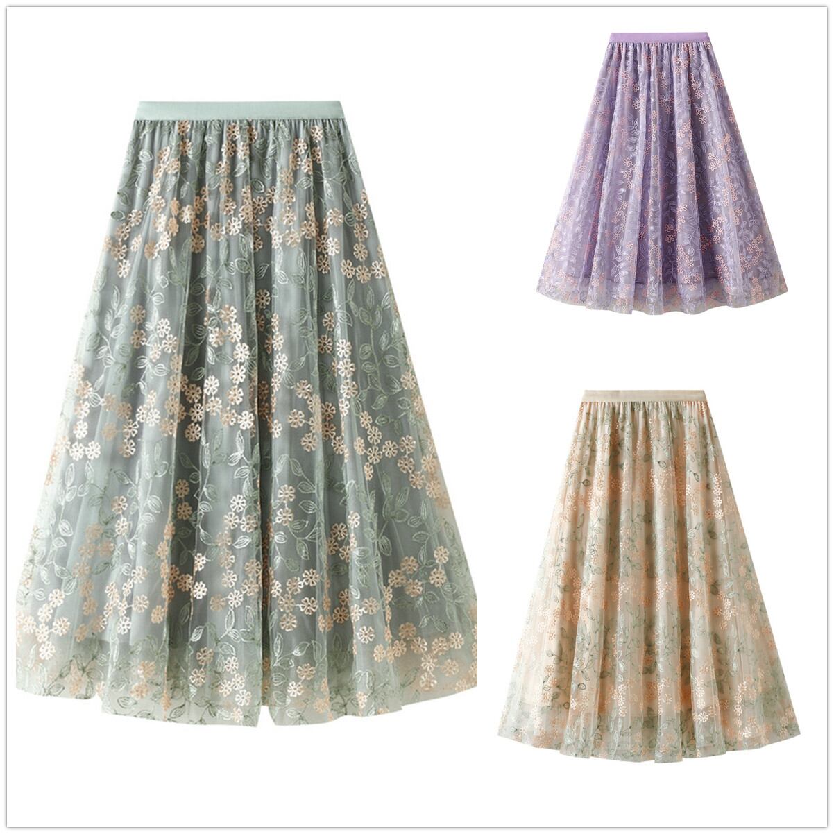 ◎【送料無料】2026秋新作 スカート レディース ロングスカート メッシュ 花柄スカート ウエストゴム 刺しゅう 気質 4色