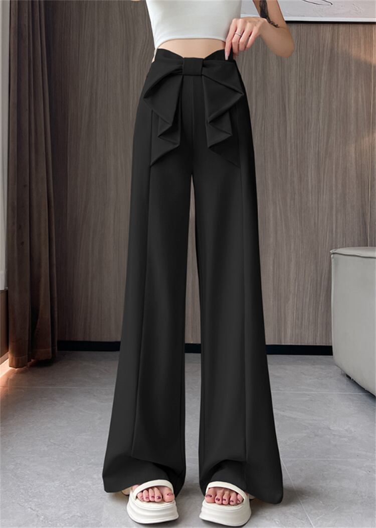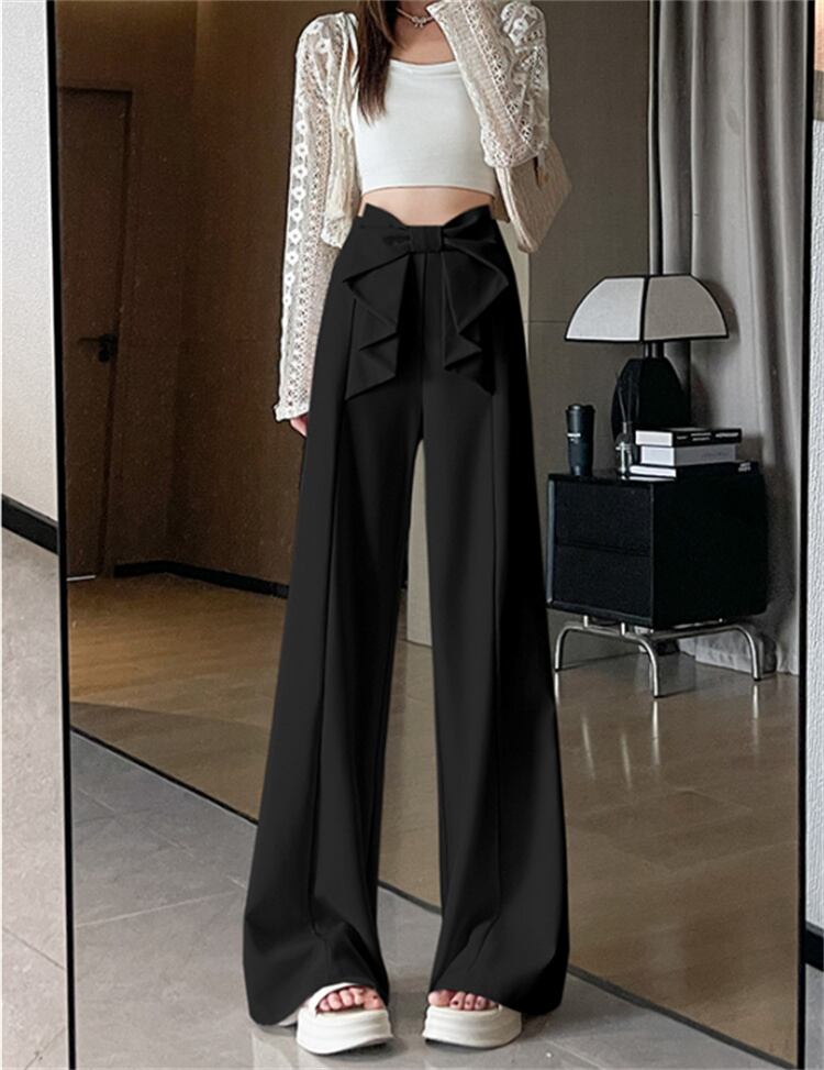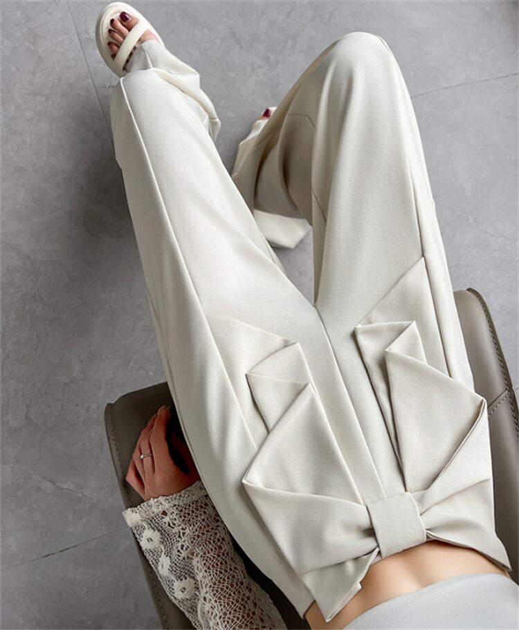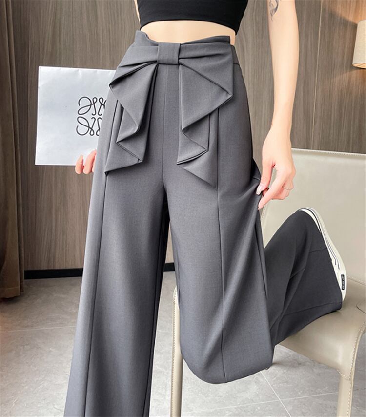 夏のオフィスパンツ ひも飾り ストレート脚ライン ゆったり丈(ハイウエスト)