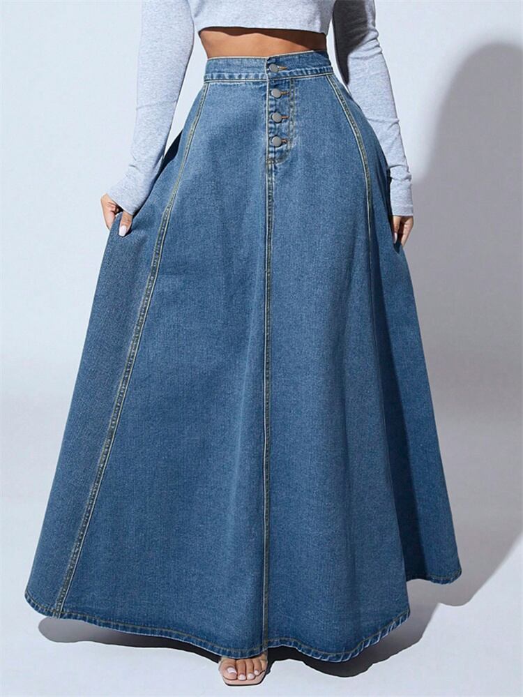 春のワードローブに取り入れたいデニムロングスカート シンプルながらも前面ボタンが存在感を放ち