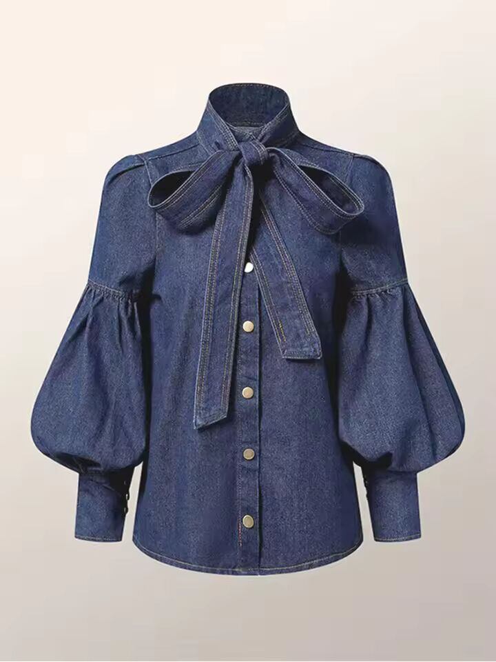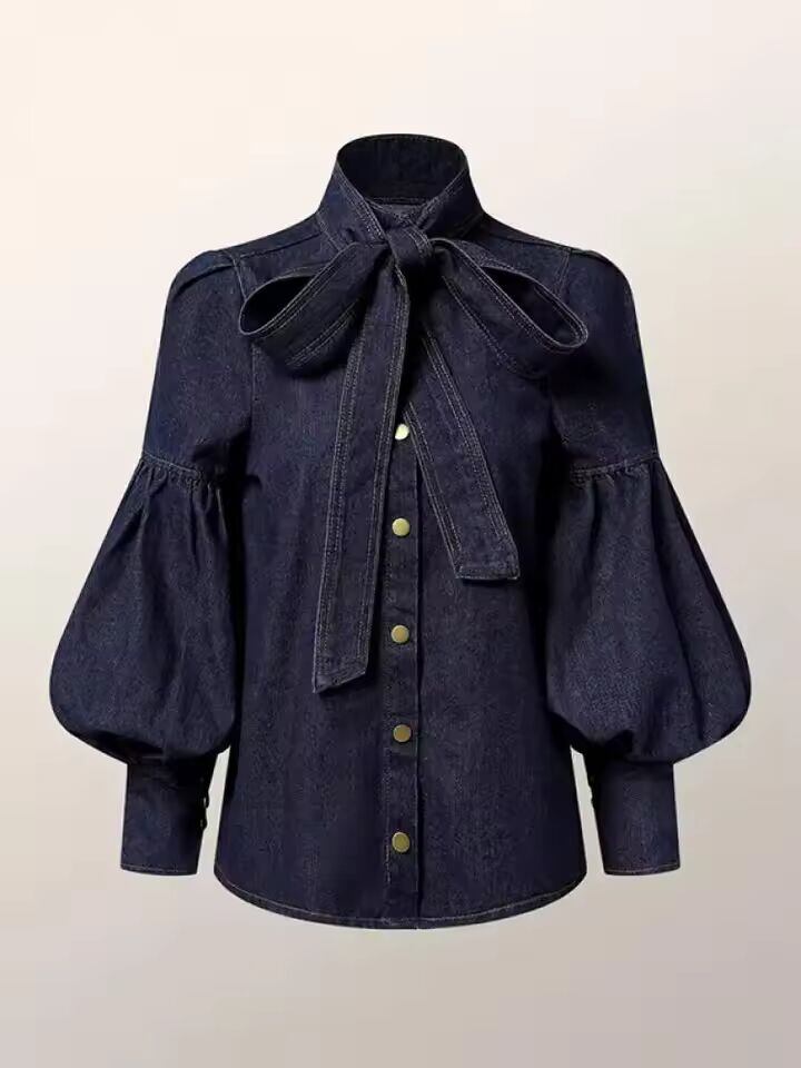 【送料無料◎】 Gymystars 新しいトレンディなイミテーションデニムブラウストップス女性のためのロングパフスリーブリボン装飾ハイネック女性の秋のシャツ