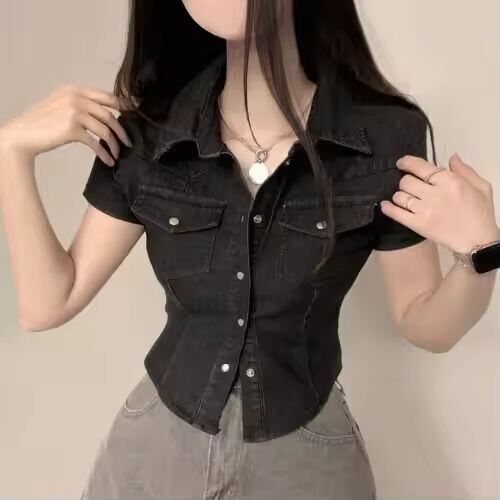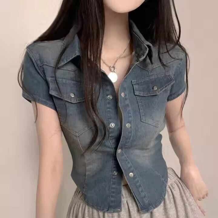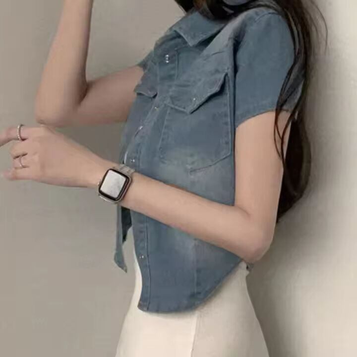 【送料無料◎】 レディーススリムフィット半袖デニムシャツ 春2025 韓国風 多用途 ウエストシェイプ おしゃれ カジュアル アウター