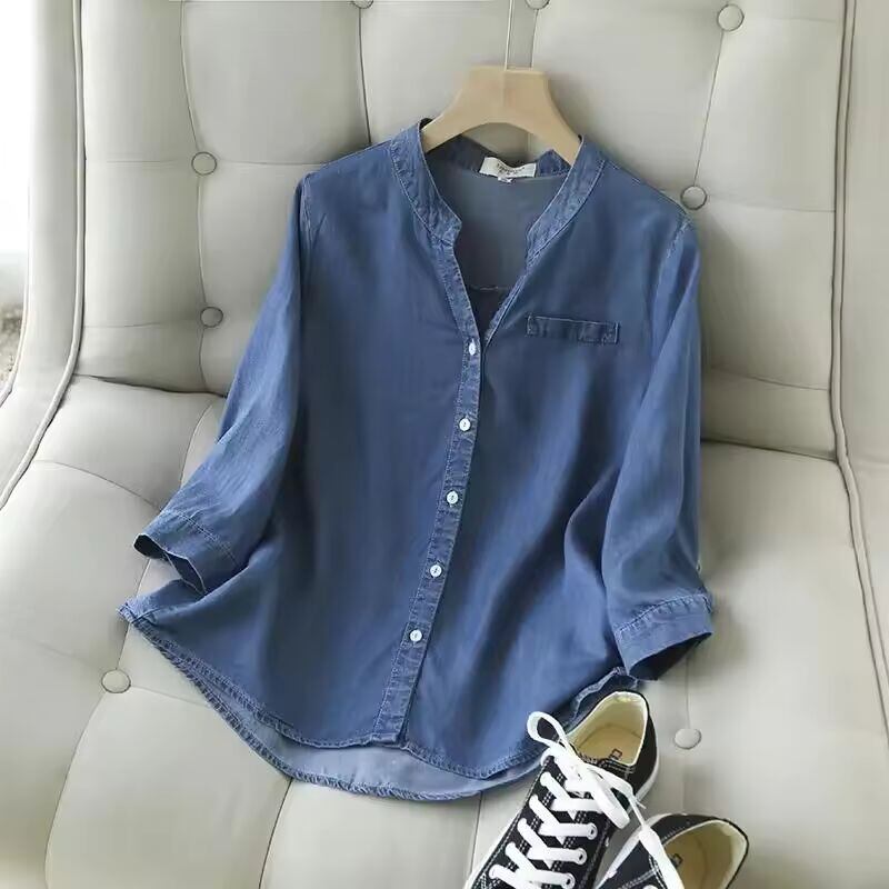 【送料無料◎】 女性用ブルーデニムシャツ,Vネック,七分袖,韓国ファッション,女性用lyocellトップス