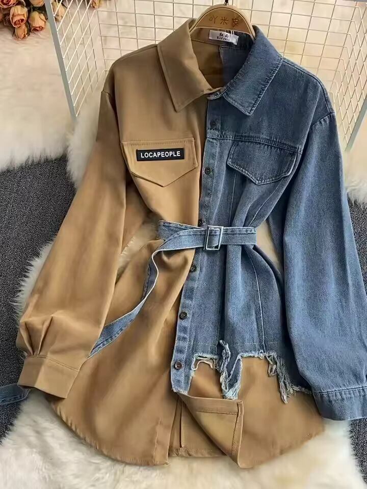 【送料無料◎】 春の新作秋の女性のデニムシャツカラーコントラストパッチワークレースアップブラウスショー薄型多用途トップファッション GD596