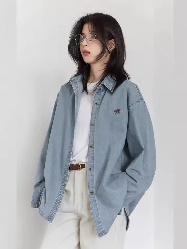 【送料無料◎】 シックな VEN 韓国女性ブラウスルーズシングルブレスト弓刺繍デニムシャツブルーシャツ女性のためのコート春秋 2025