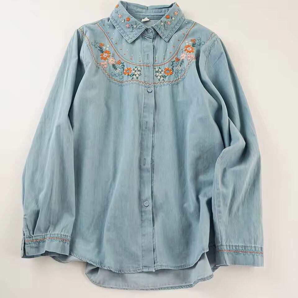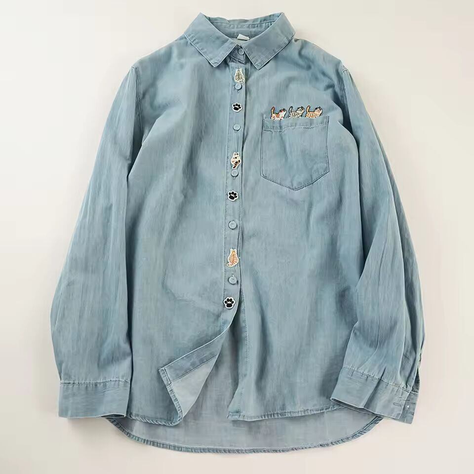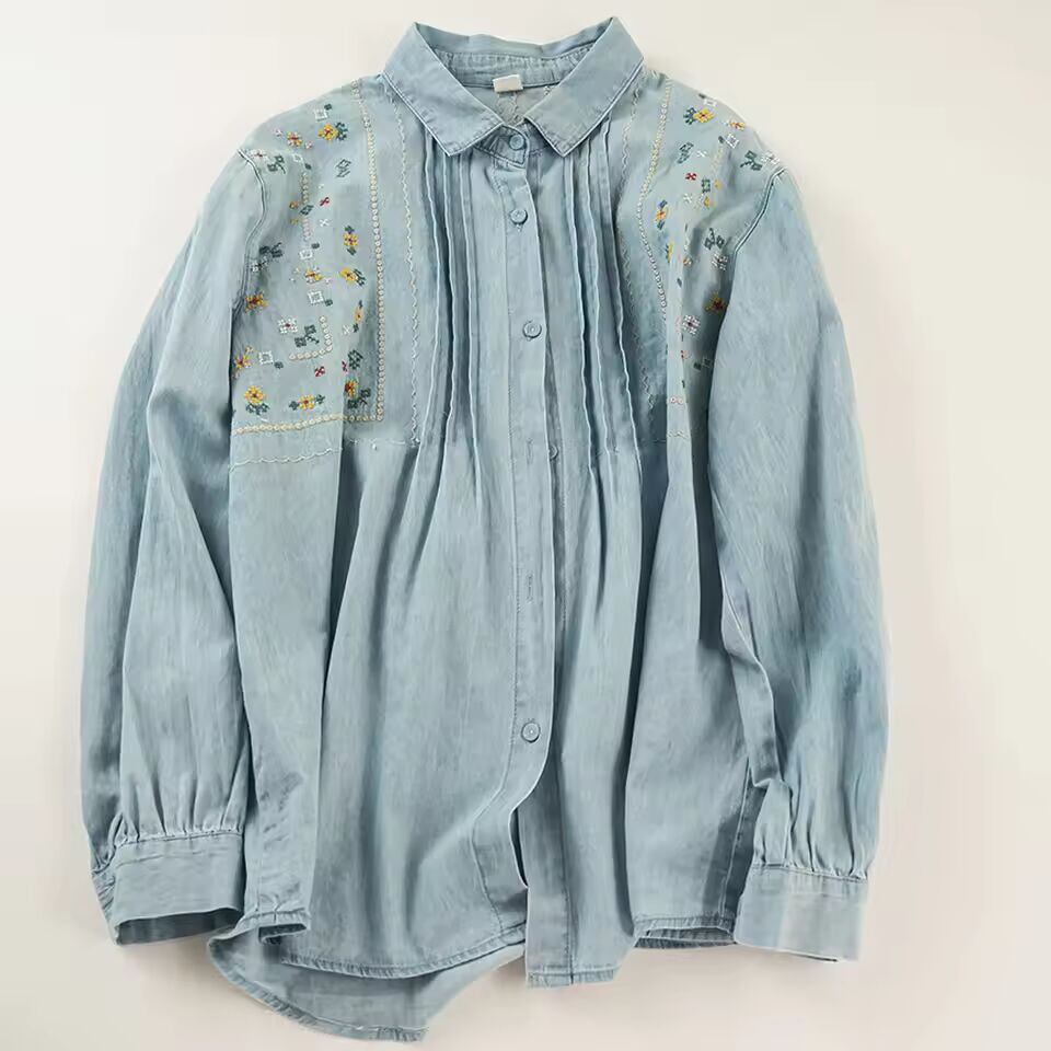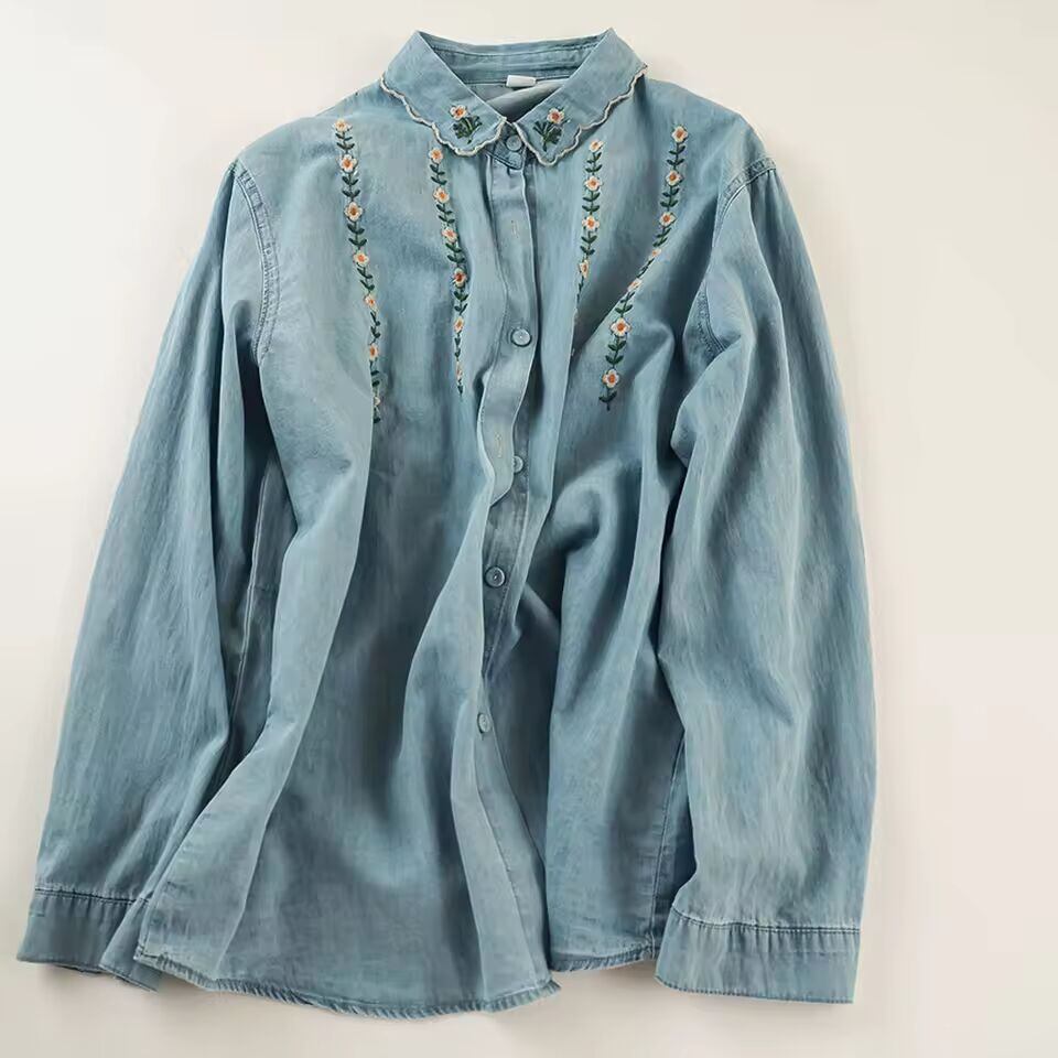 【送料無料◎】 原宿ファッション綿デニム春ブラウス 2025 長袖女性の刺繍シャツかわいいブラウス女性ジーンズシャツ
