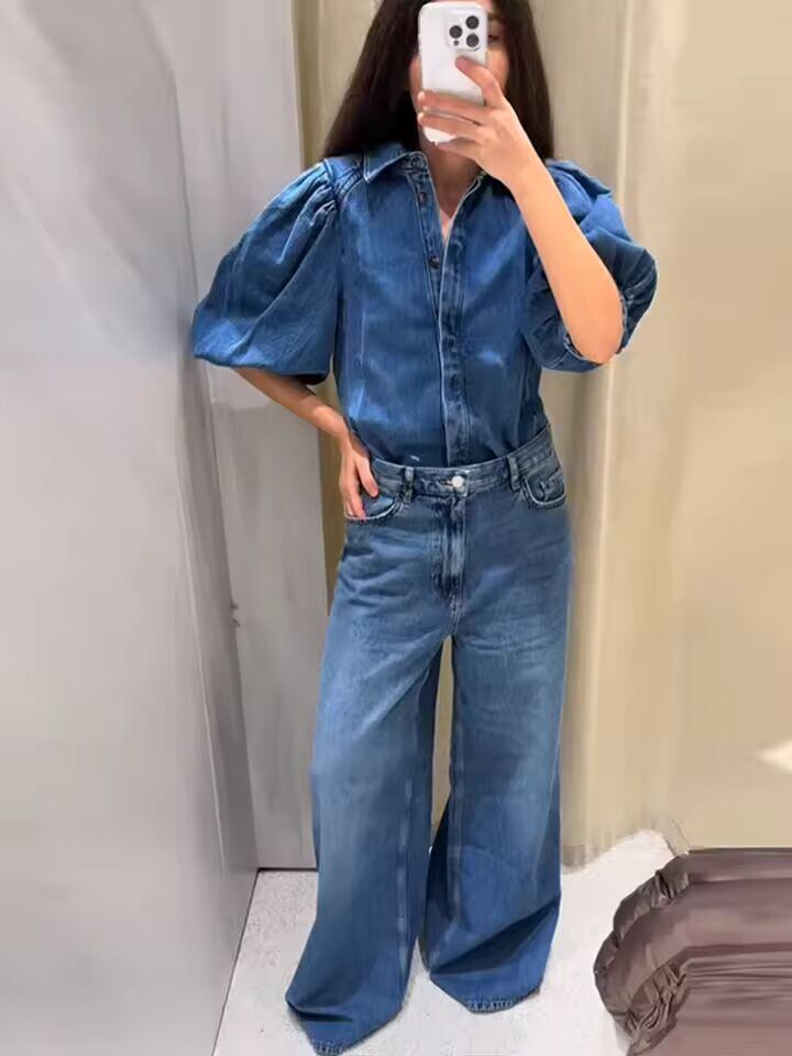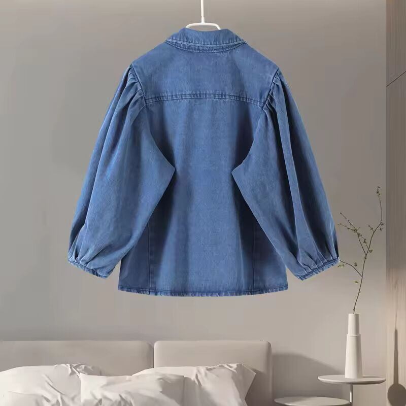 【送料無料◎】 ファッションブルーデニムレディースシャツハーフパフスリーブターンダウンカラープリーツ女性シャツ2025秋春ストリートレディトップス