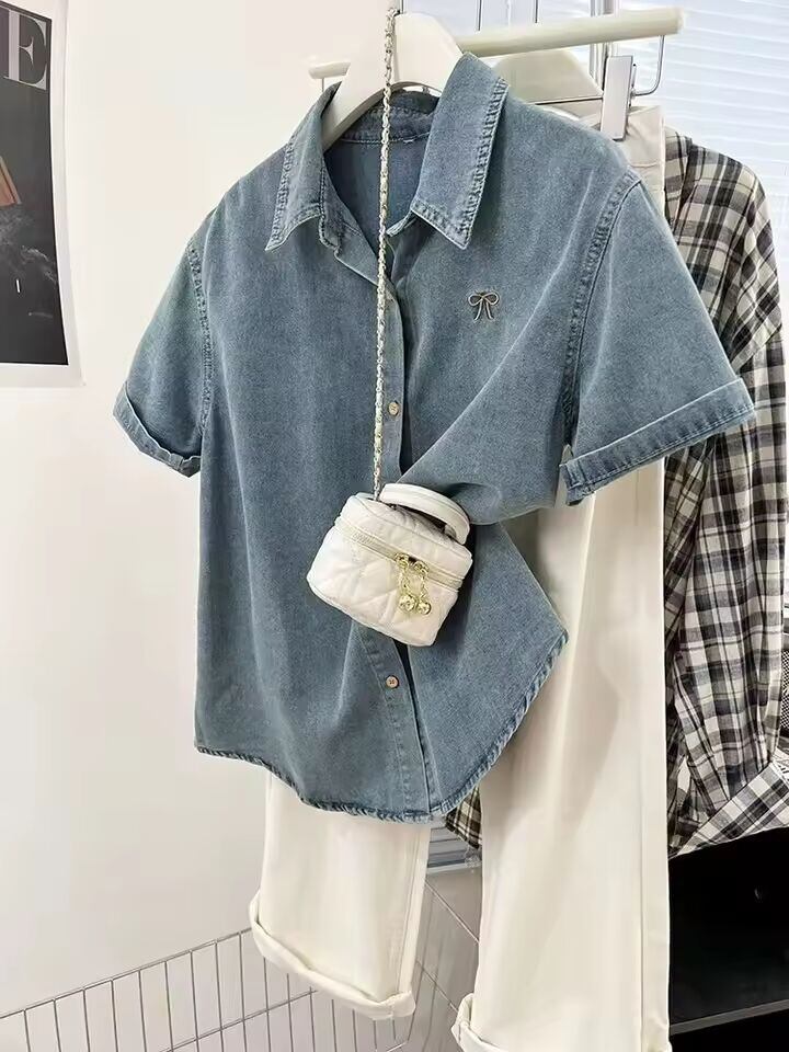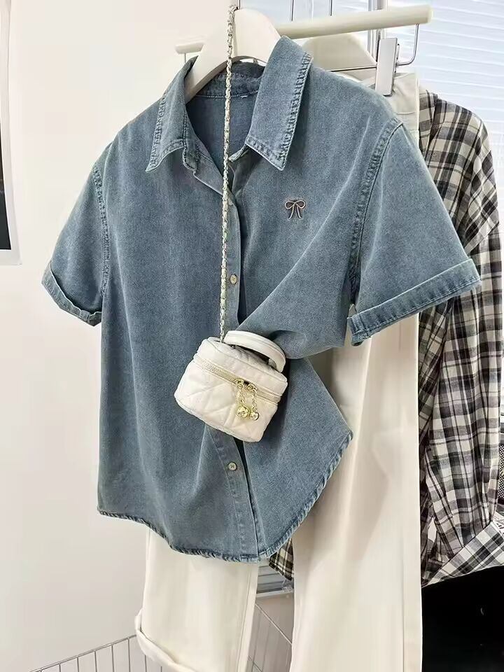 【送料無料◎】 甘い香港スタイル半袖デニムシャツ女性の夏のデザインユニークな小さいサイズのシャツトレンディなトップスルーズフィット韓国スタイル