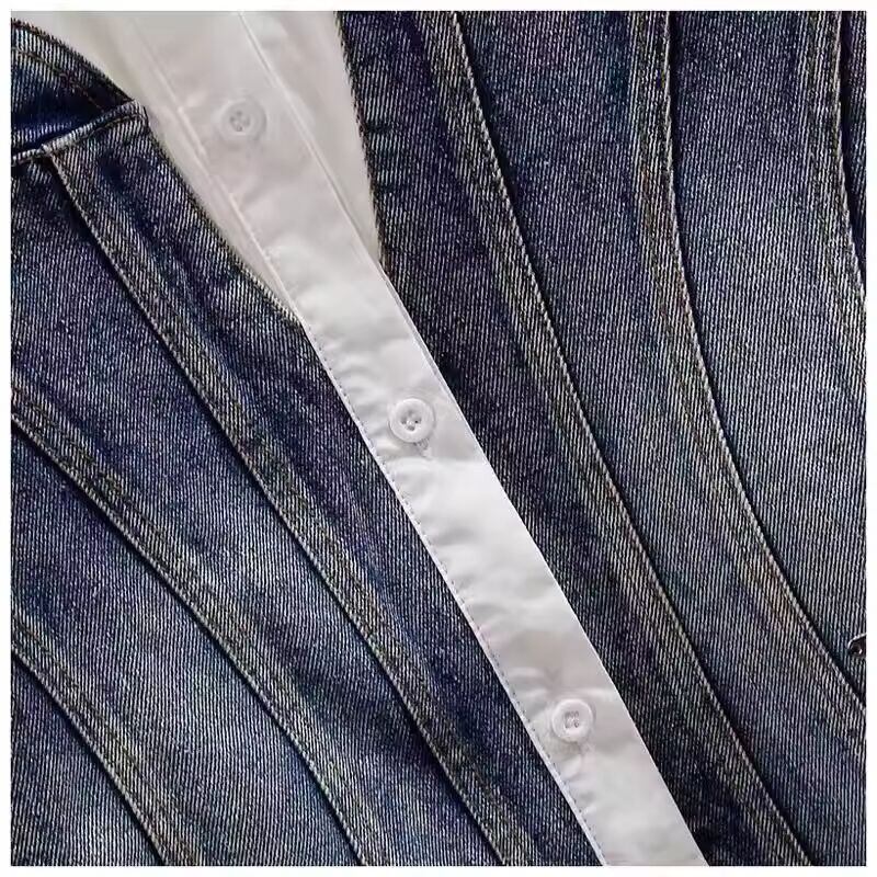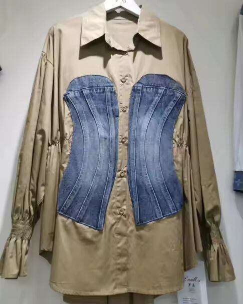 【送料無料◎】 WTHT-レディースシングルブレストブラウス,デニムウエストスリミングシャツ,長袖,パッチワーク,レディースファッション,秋,2024