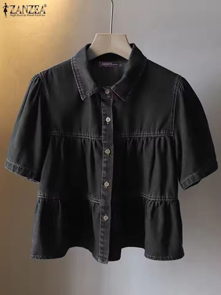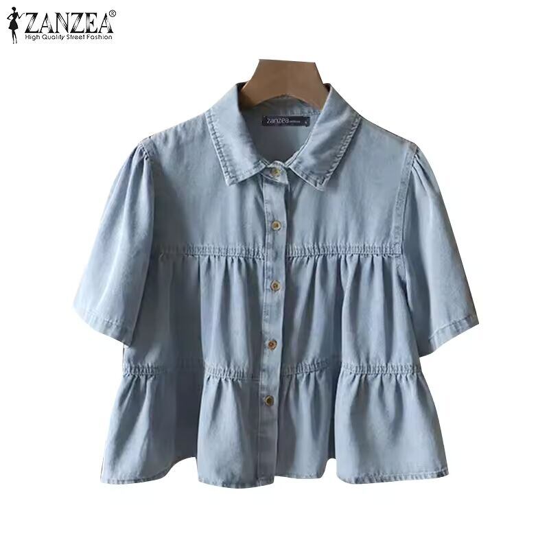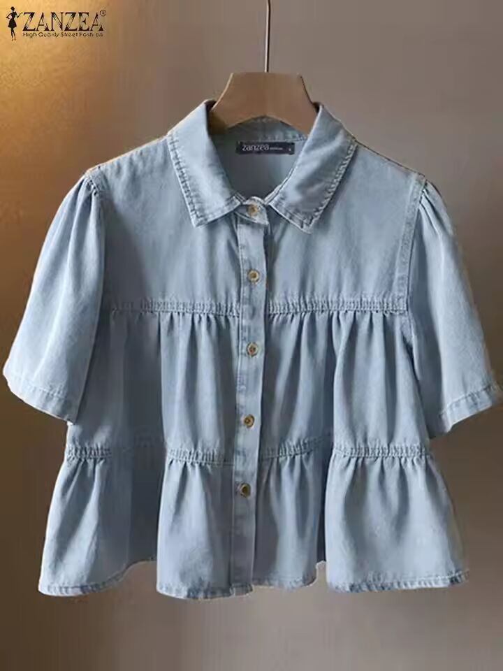 【送料無料◎】 Zanzea-女性用の襟付き半袖ブラウス,フリル付きの丈夫なトップス,カジュアルなデニムシャツ,パーティー,韓国のファッション,夏
