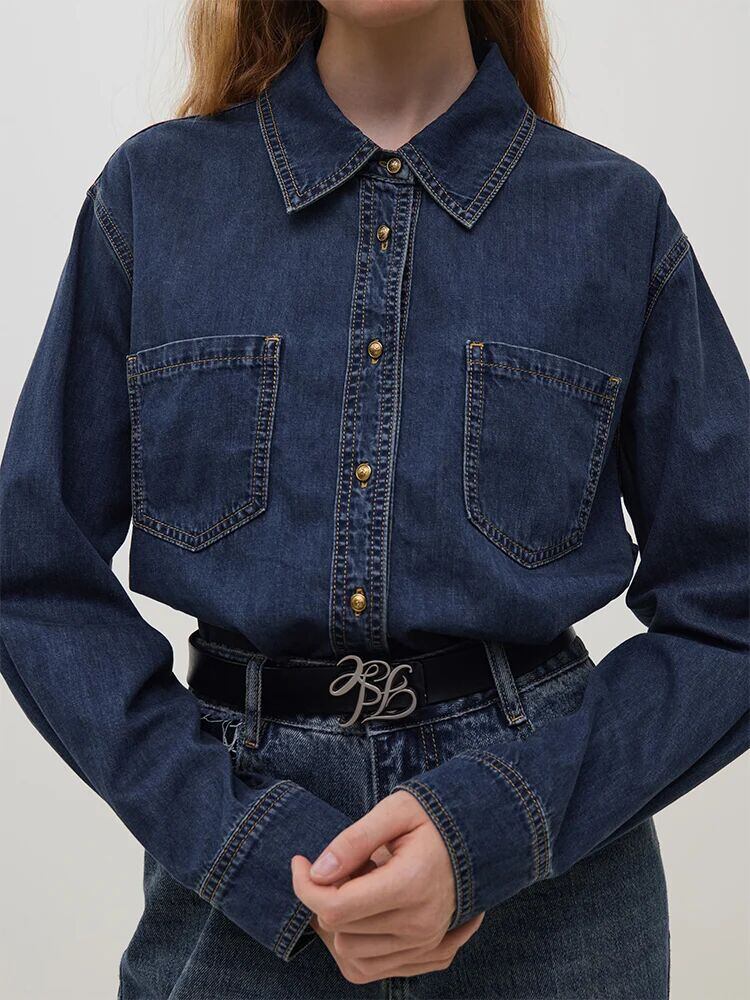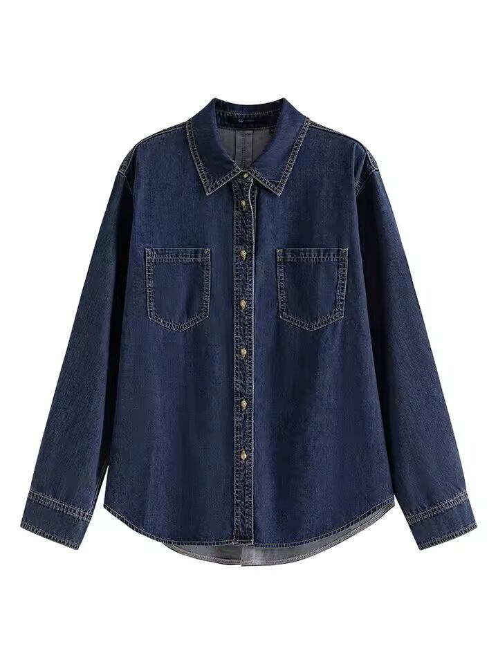 【送料無料◎】 Fsle-女性のためのディープブルーソフトデニムシャツ、カジュアルレイヤードシャツ、仕事のための長袖トップス、レトロな仕事、秋と冬