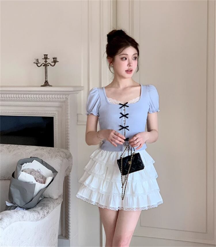 ◎【送料無料】【2025夏】レース拼接リボン付き 高腰Aライン プリーツケーキスカート ショート丈