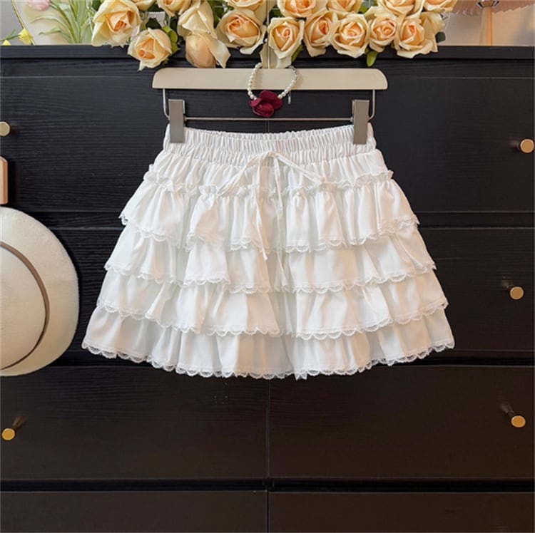 【2025夏】レース拼接リボン付き 高腰Aライン プリーツケーキスカート ショート丈