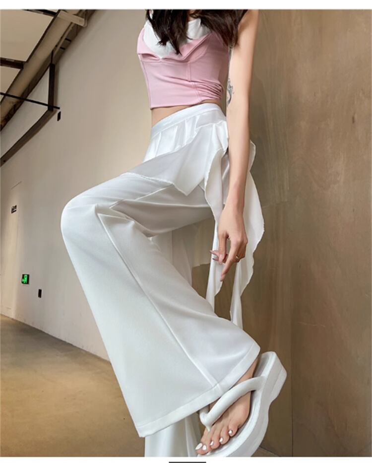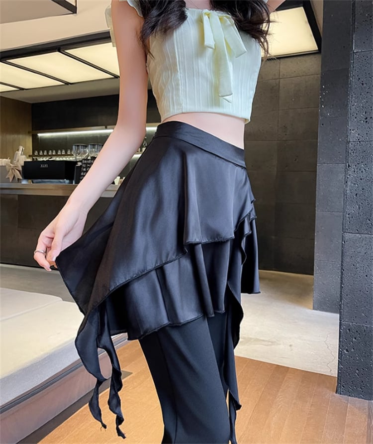 見せかけツーウェイ フレアパンツ フリル裾 ゴムベルトハイウエスト 夏向けロングパンツ