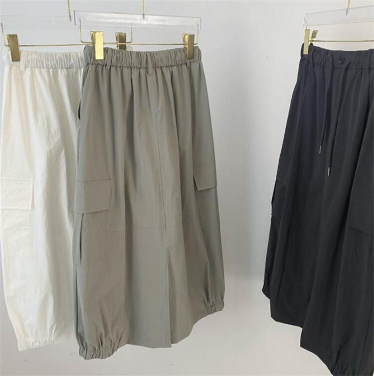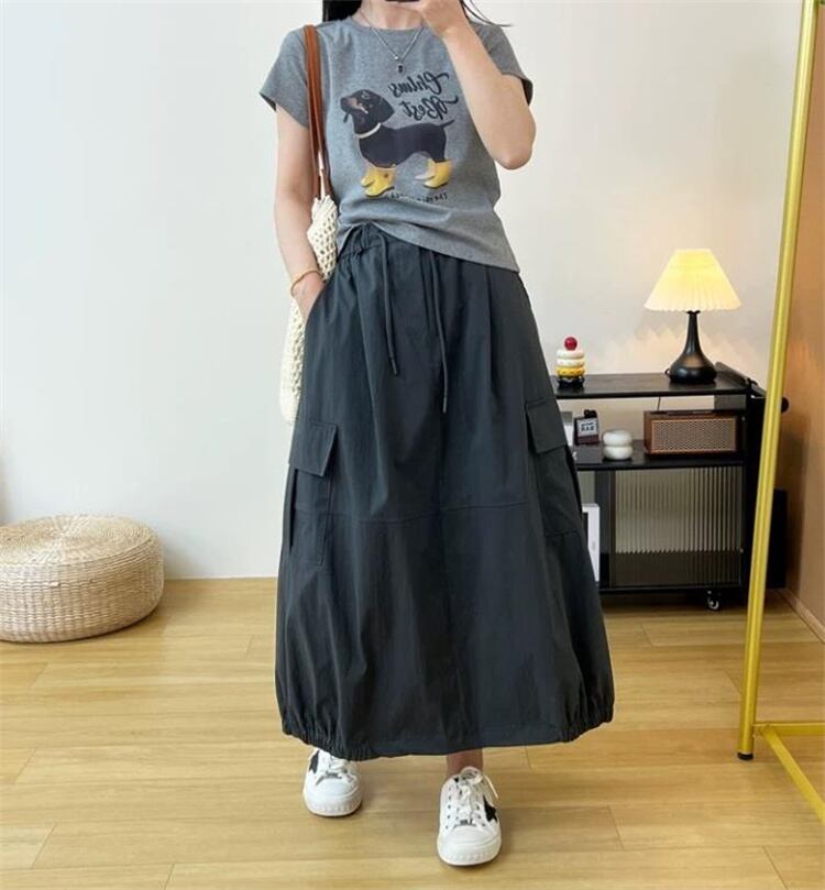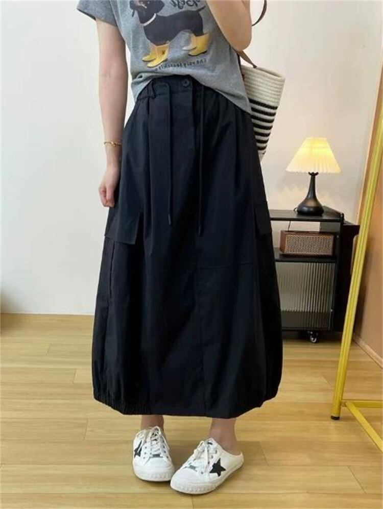 ◎【送料無料】アメリカンレトロデザイン Aラインゴムウエストドローストリングプリーツワークロングスカート