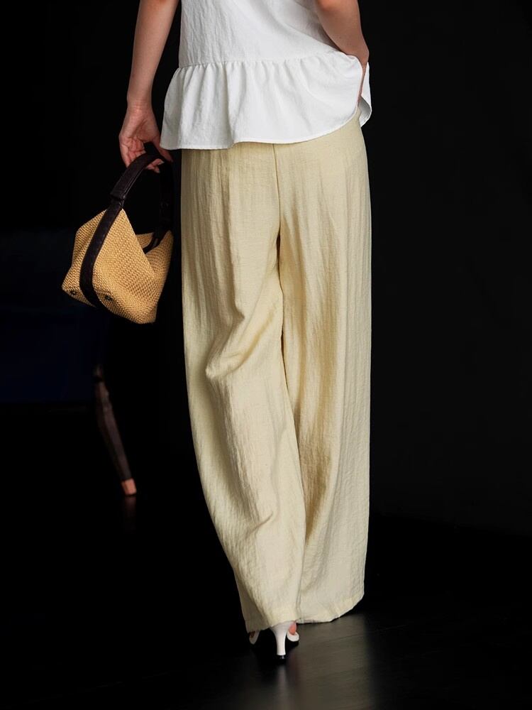 夏の涼感スタイルアップ麻薄手ストレートワイドパンツ抗シワ加工付き