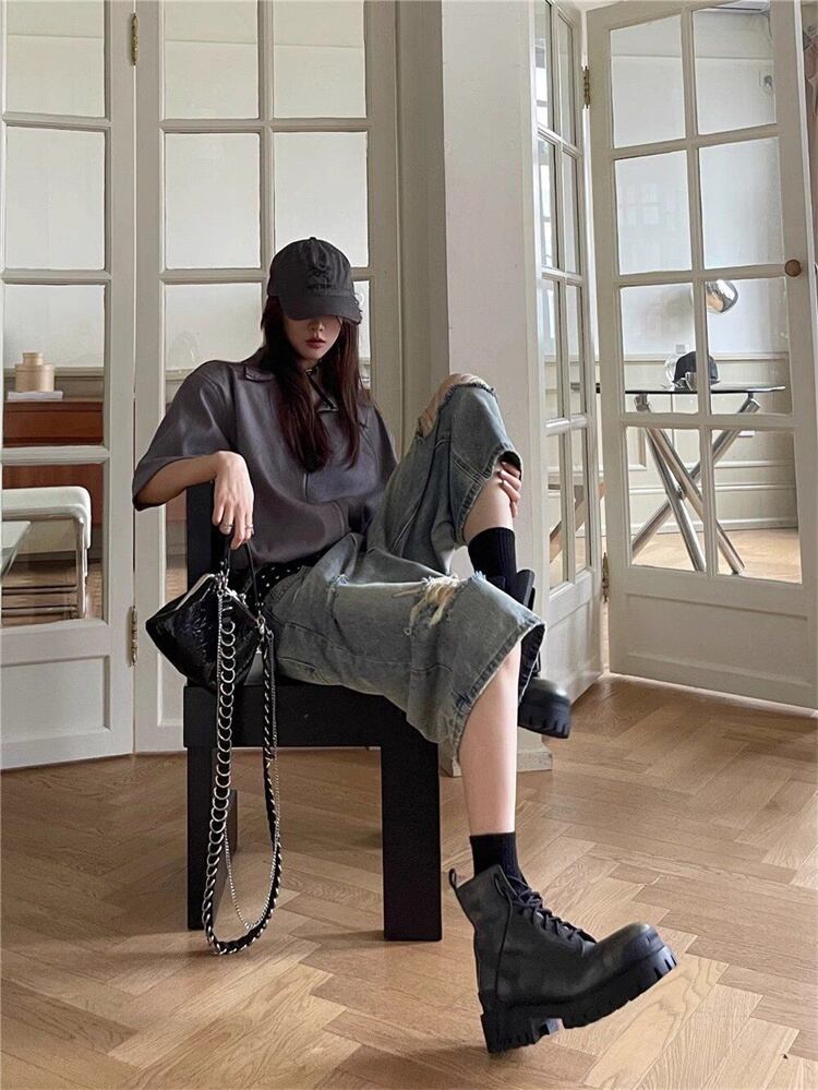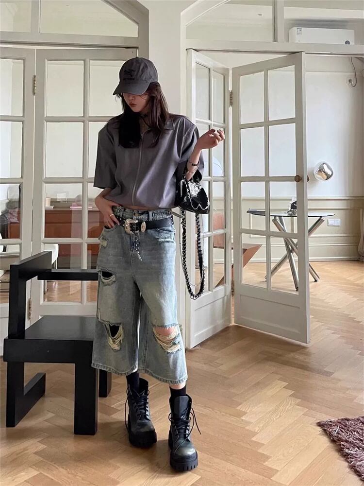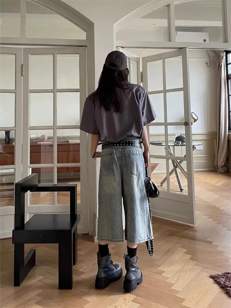 2025新作 夏 ハイウエスト レトロデニム ワイドストレートパンツ 破れ加工 7分丈
