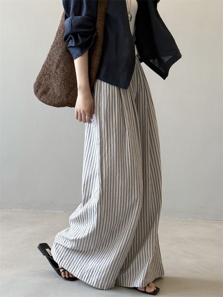 ストライプ直筒ワイドパンツ ハイウエストデザイン 春夏秋兼用カジュアルパンツ