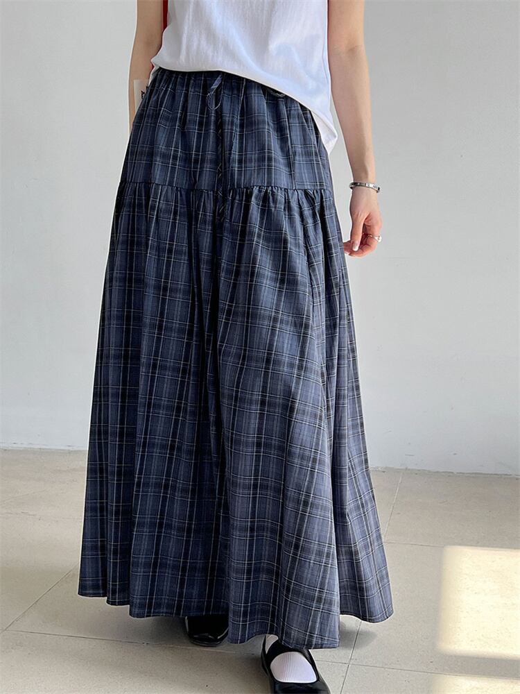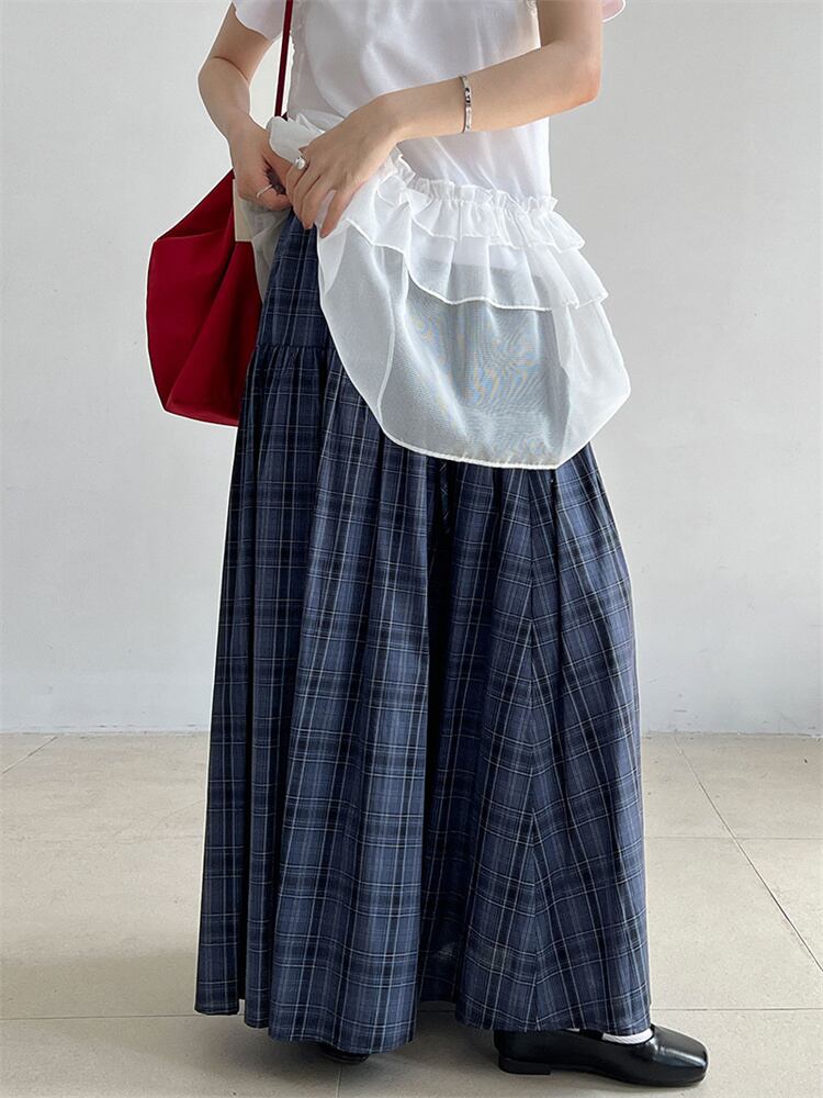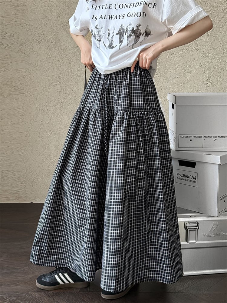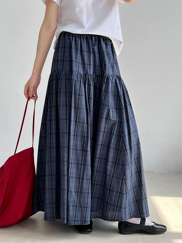 2025年夏物 チェック柄拼接 Aラインアンブレラスカート 伸縮ウエスト
