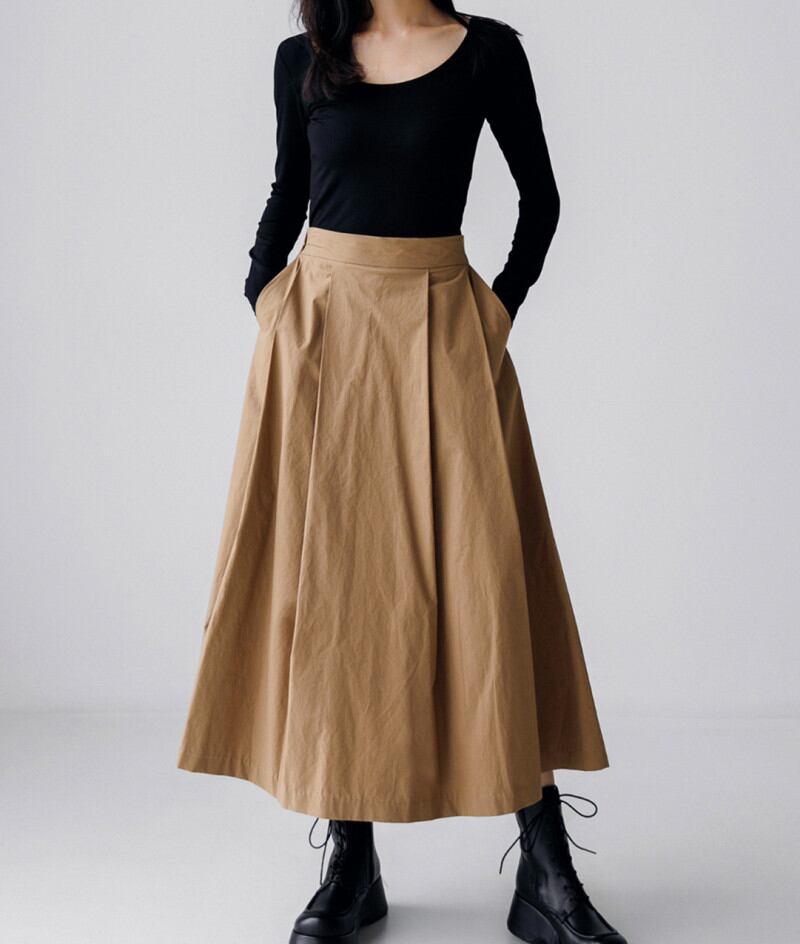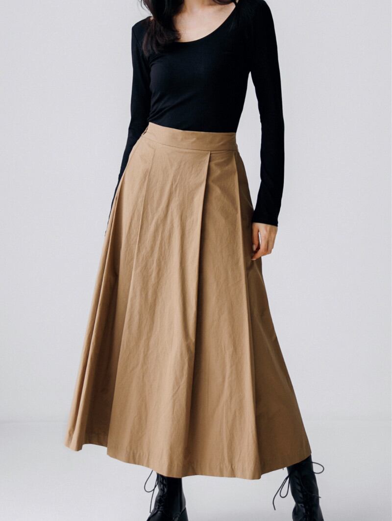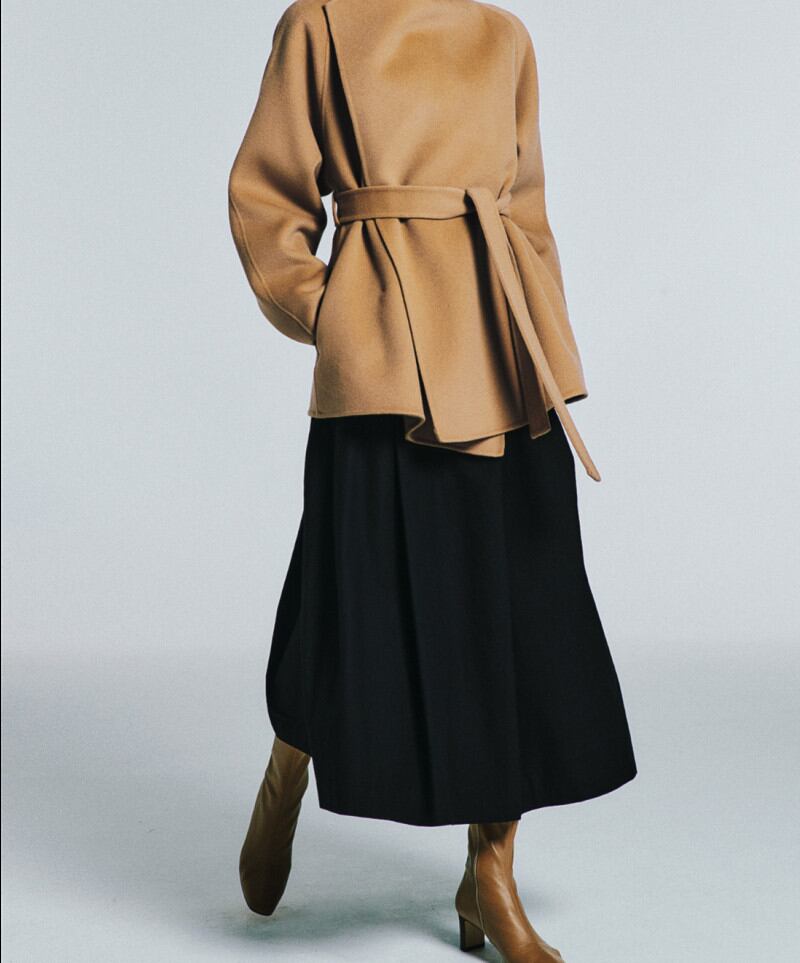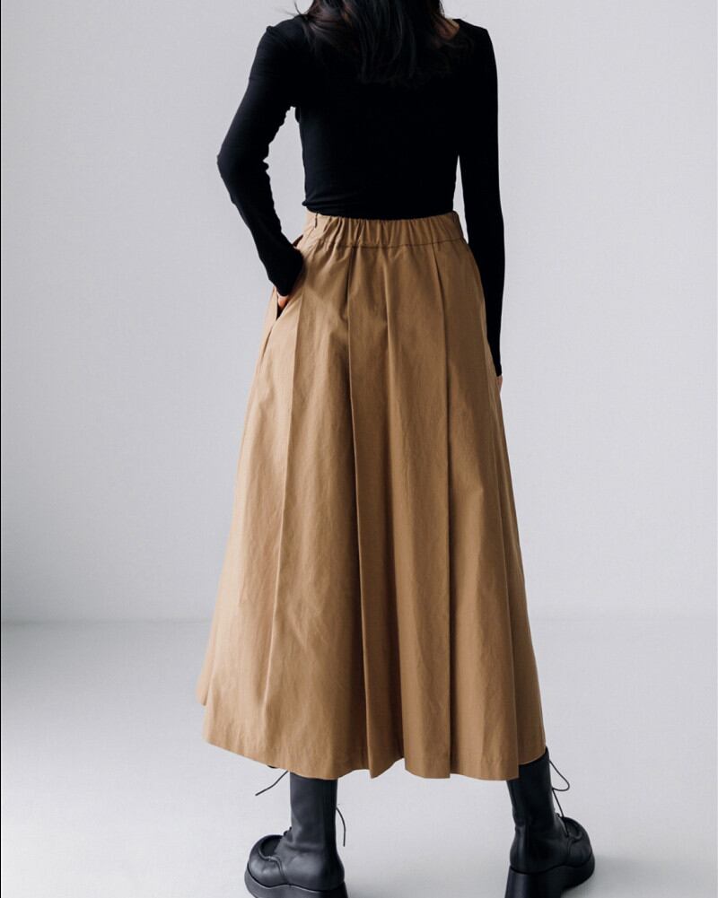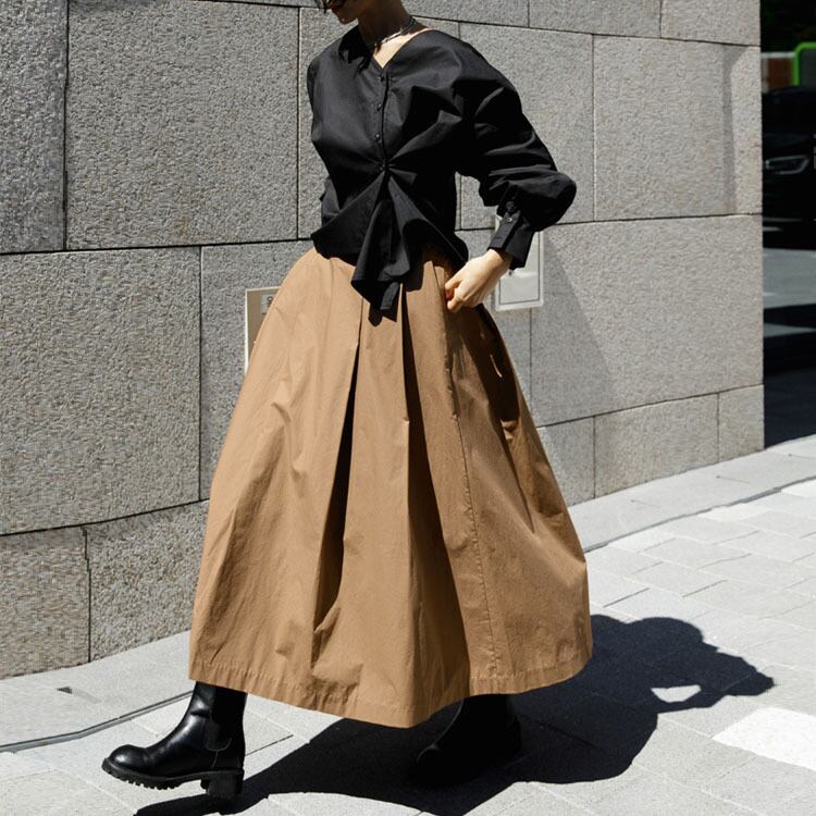 体のラインを拾いすぎないシルエットと動きあるフレアが足長効果抜群。