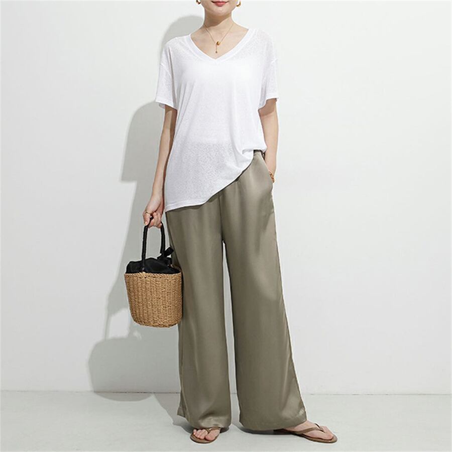 秋にピッタリな素材のワイドパンツは今季注目のアイテム。