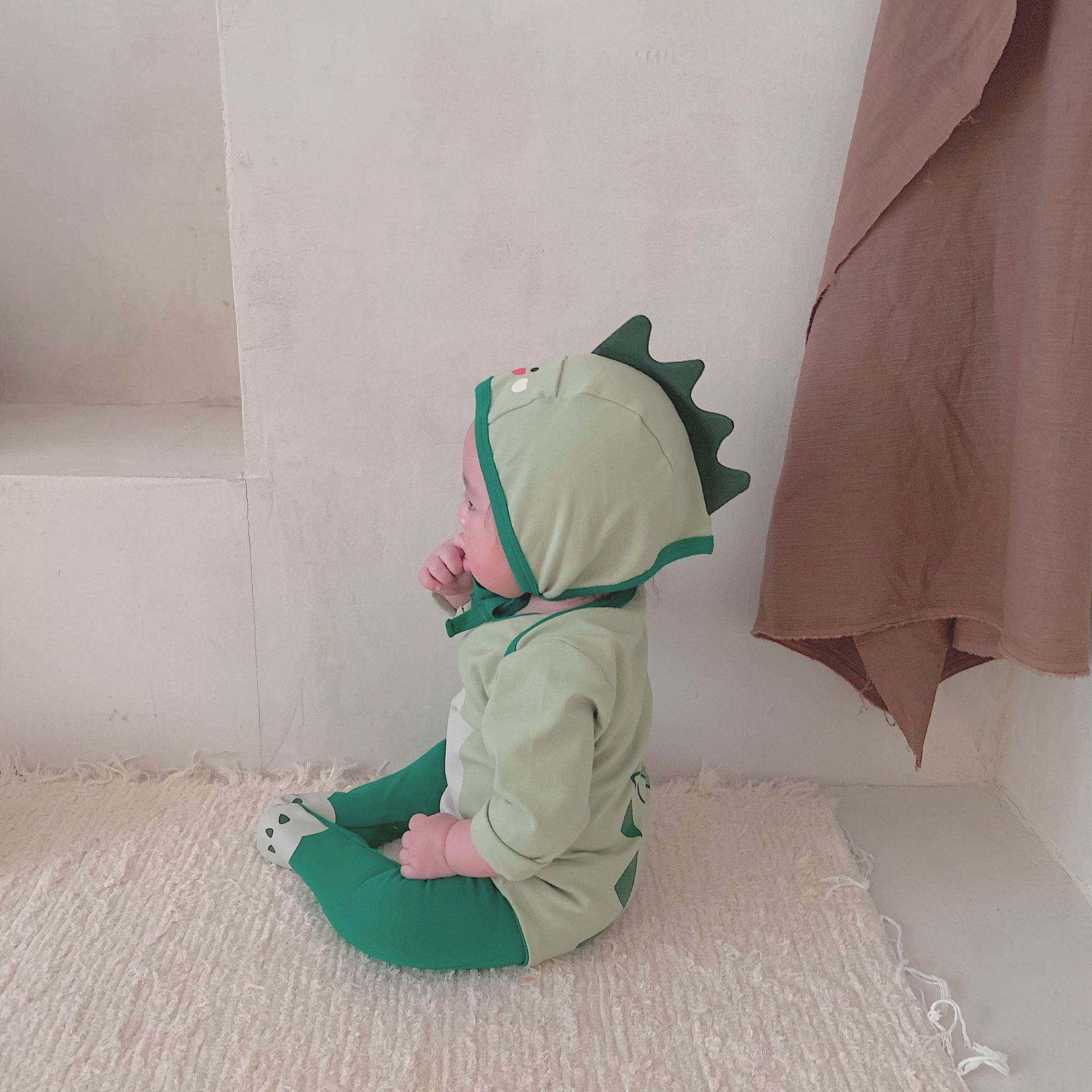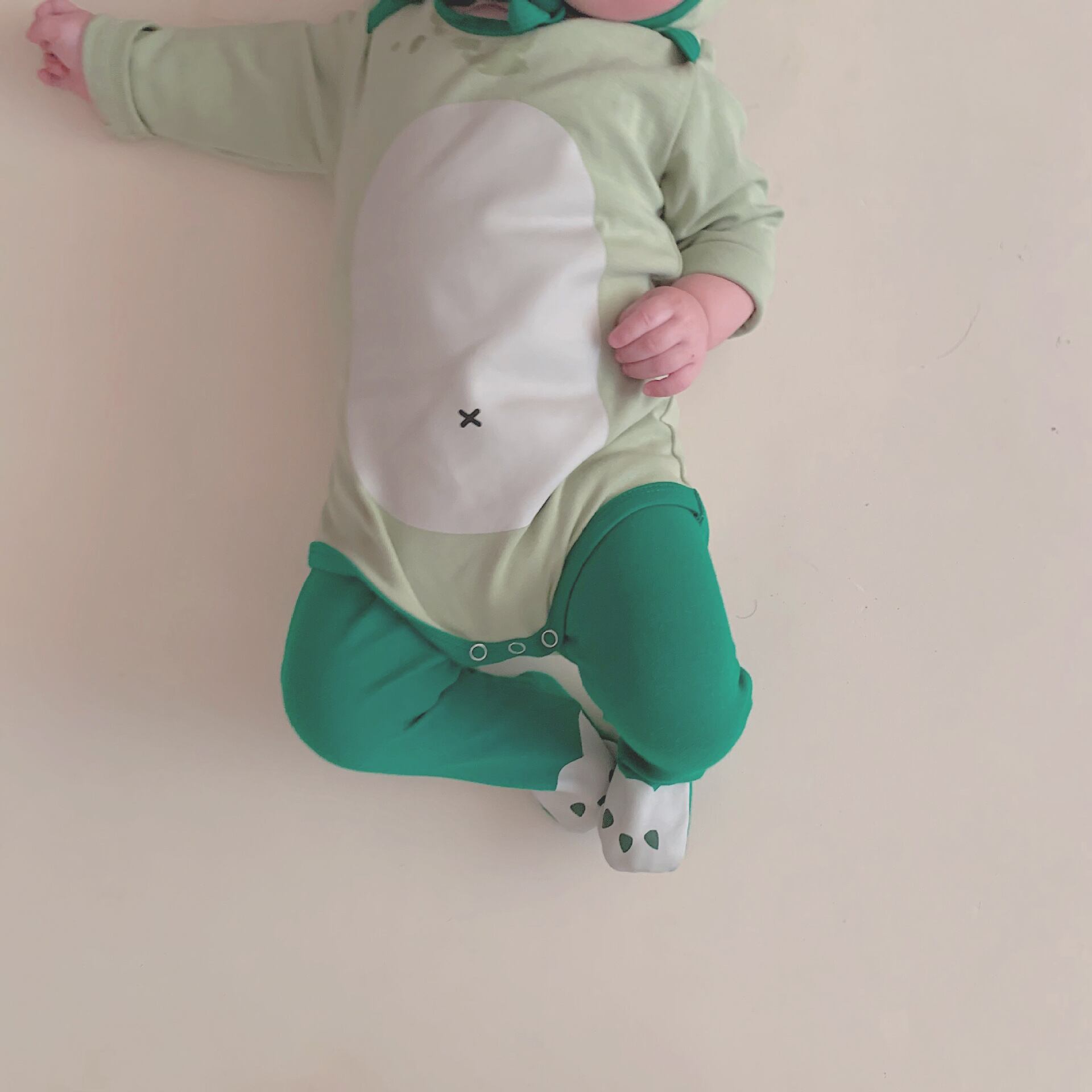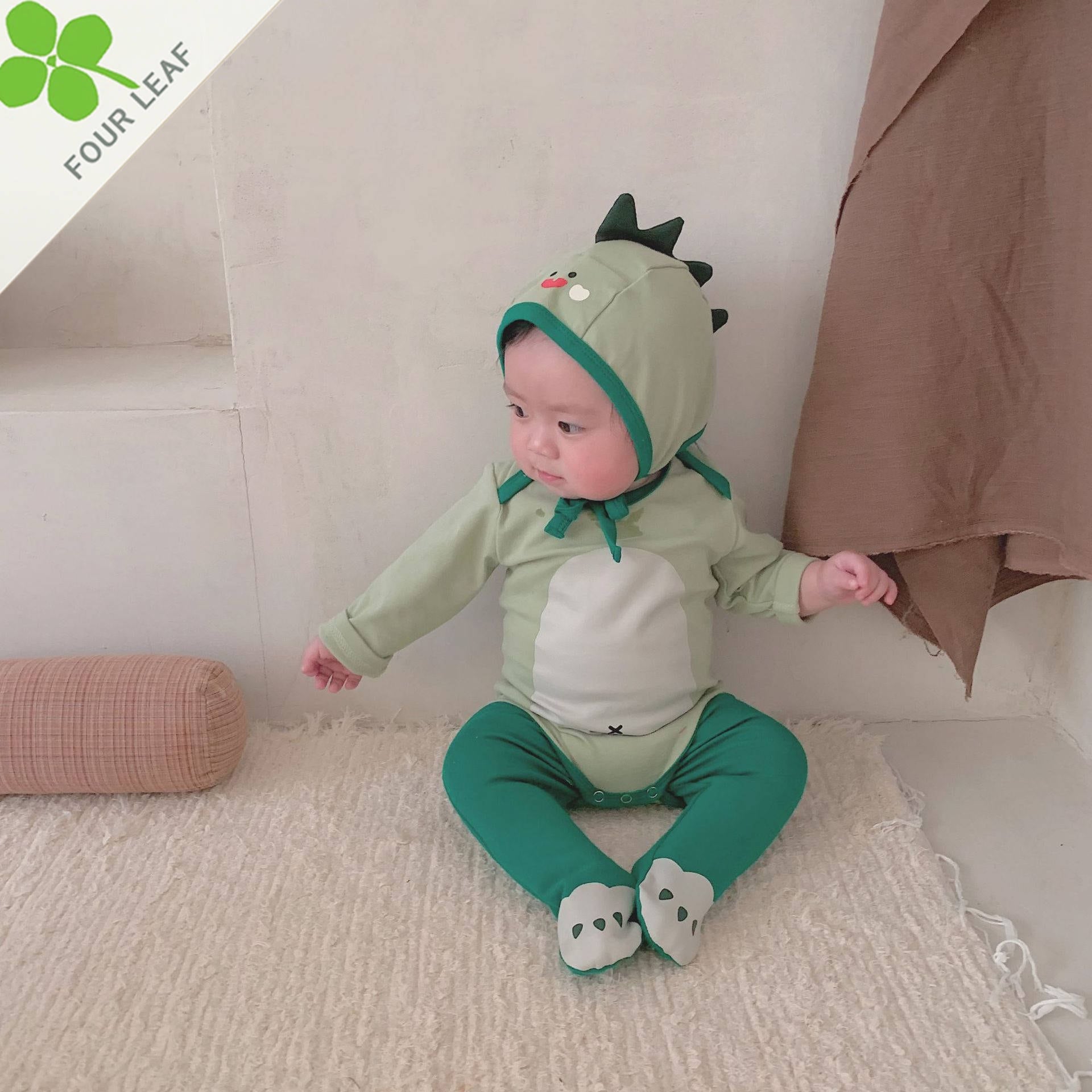 ◎【送料無料】恐竜柄 ロンパース 3点セット 帽子付き 長袖 ロングパンツ ベビーロンパース 赤ちゃん 66cm~90cm