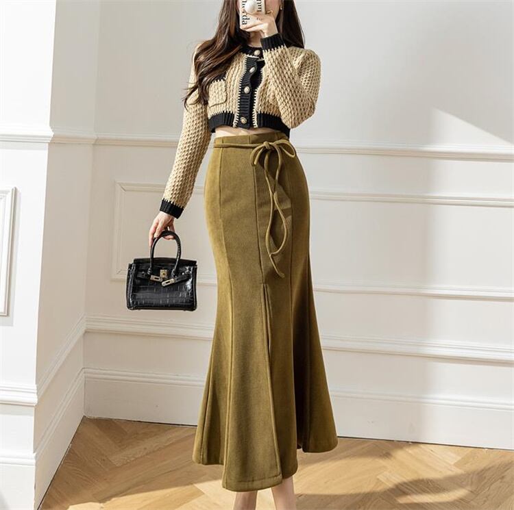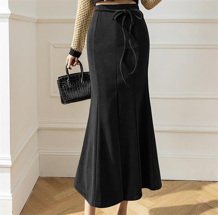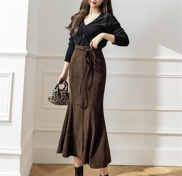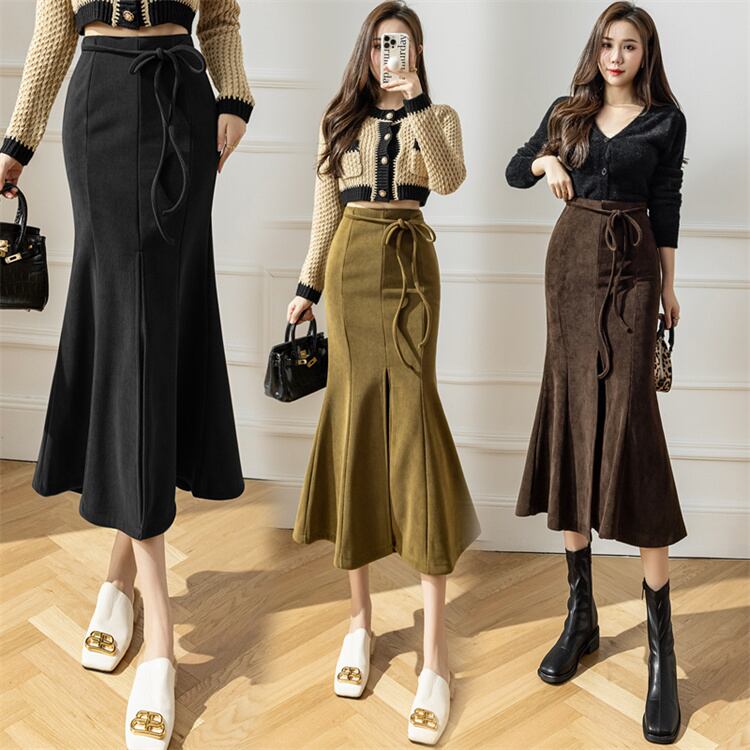 ◎【送料無料】ハイウエスト レースアップ コーデュロイ フィッシュテールスカート デザインセンス 中長セクション