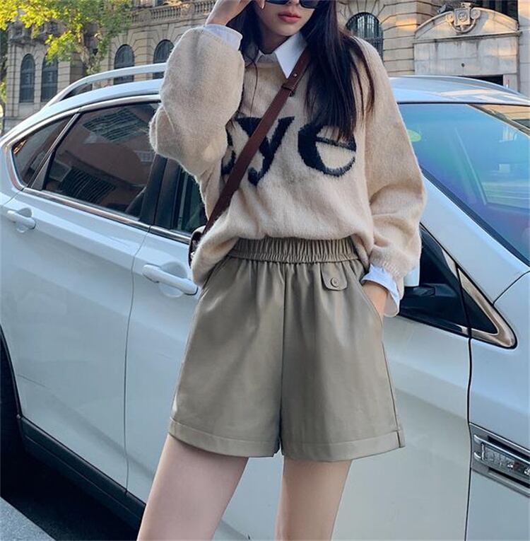 ◎【送料無料】ショートパンツ ピュアカラー 皮ズボン 伸縮性のあるウエスト ゆったりする ハイウエスト Aライン