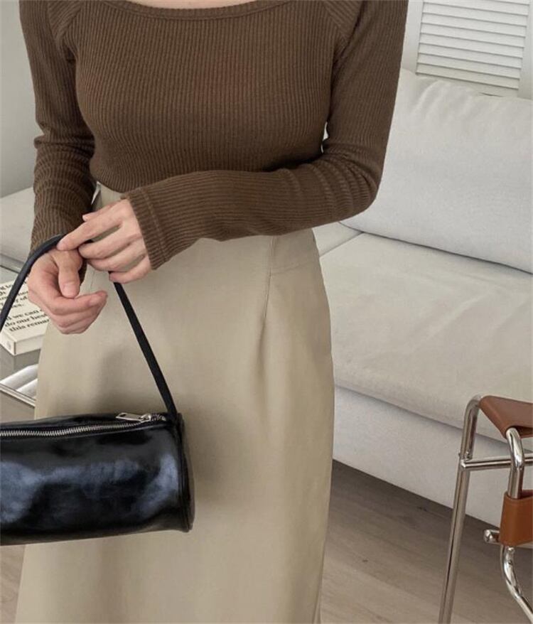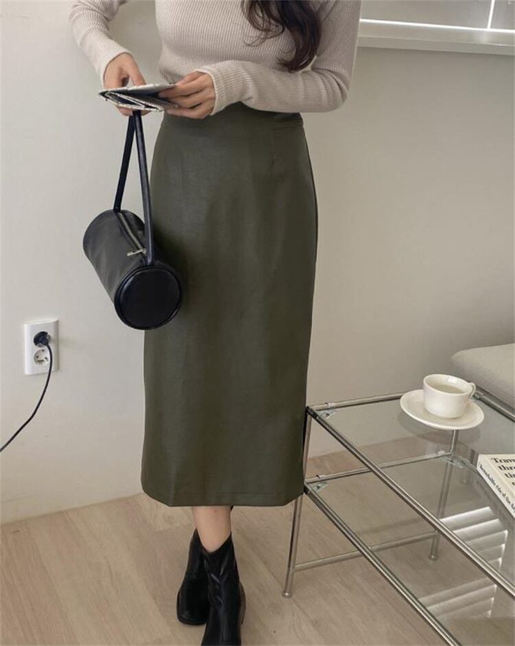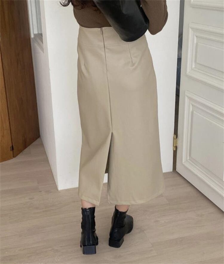 ◎【送料無料】レトロ ハイウエスト ロングスカート PUレザー Aライン レザースカート スリム デザインセンス