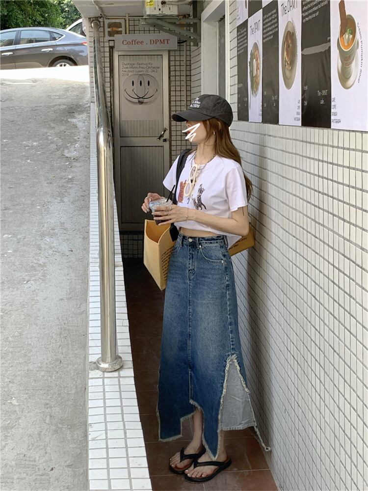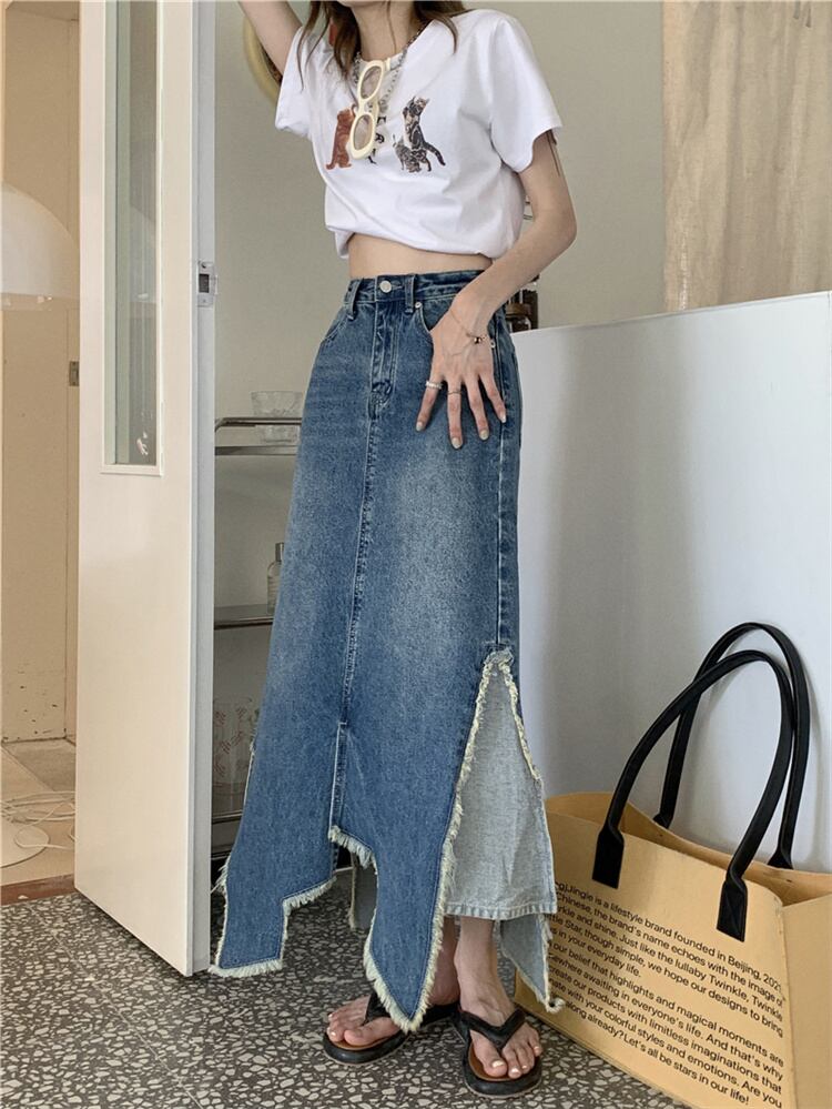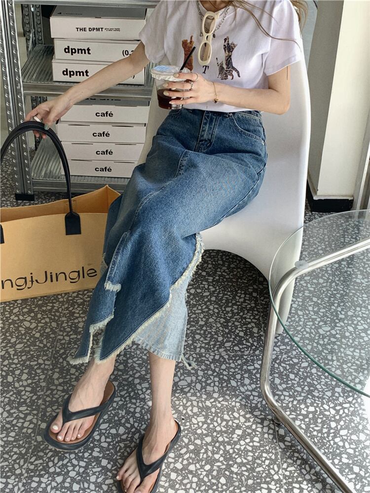 スプリット デニム イレギュラー 縫付 夏 スリム 気質 デザインセンス ロングスカート ハイウエスト