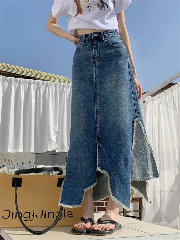◎【送料無料】スプリット デニム イレギュラー 縫付 夏 スリム 気質 デザインセンス ロングスカート ハイウエスト