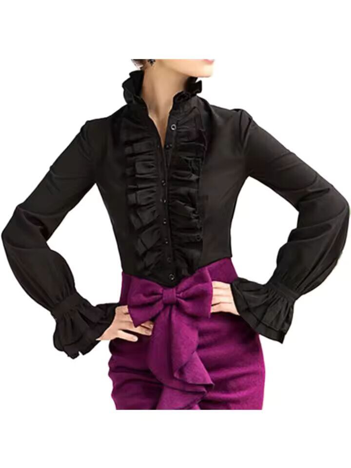 【送料無料◎】 ファッションビクトリア朝のレディーストップスフリル長袖フリル無地 OL オフィスシャツフリル袖口ハイネックブラウス秋トップス