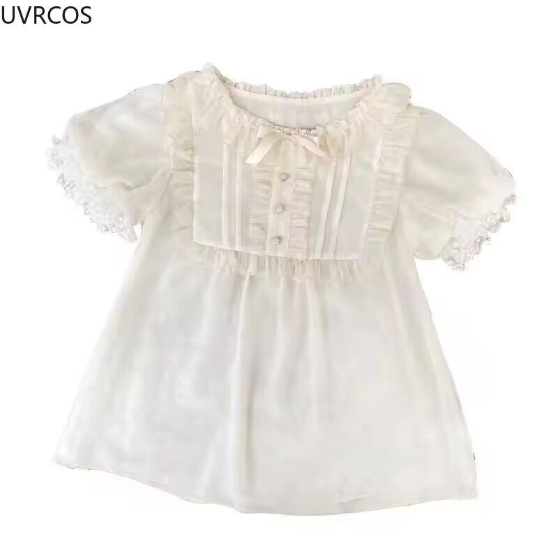 【送料無料◎】 日本のかわいいレース半袖ブラウス女性の夏の甘い弓フリル O ネックルーズシフォントップビクトリア朝の Whier Shiirts