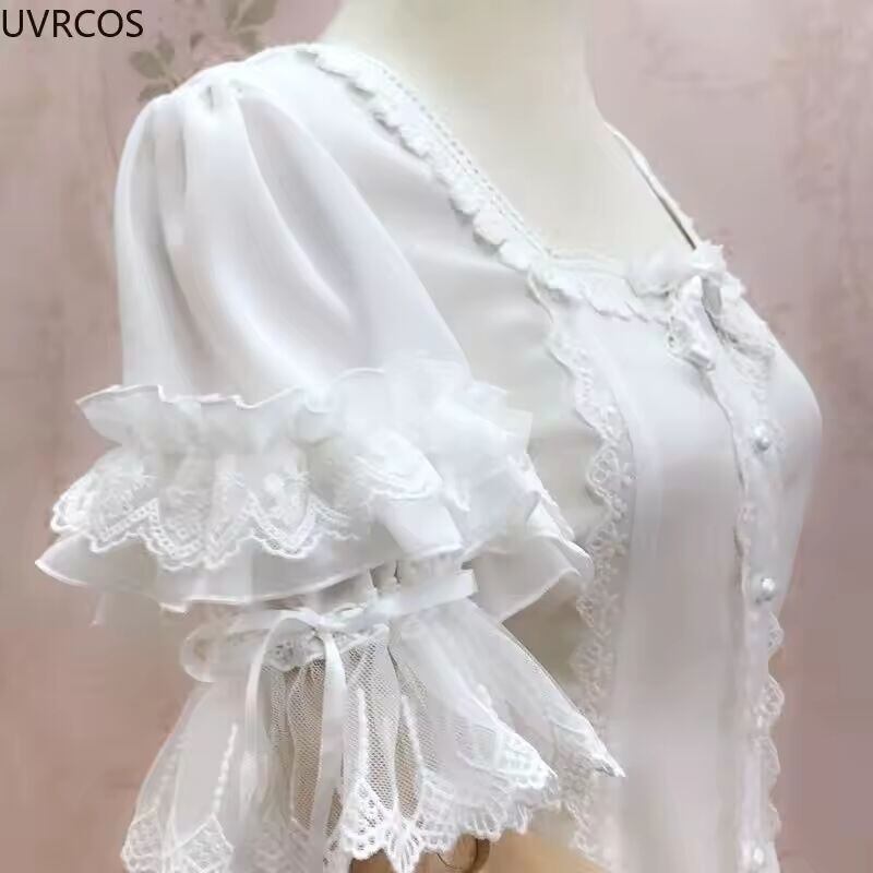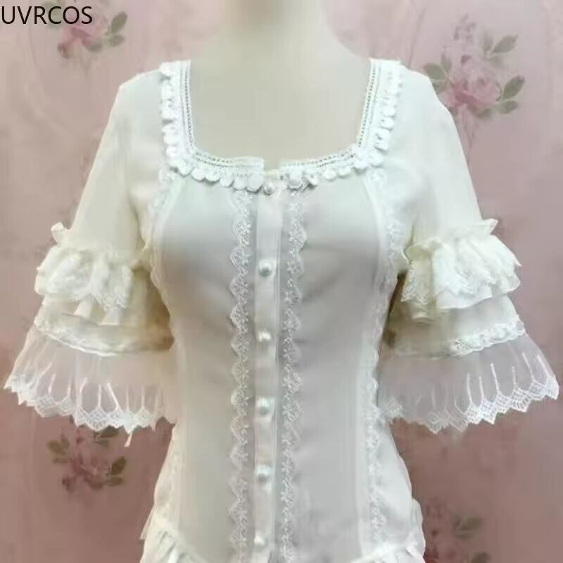 【送料無料◎】 ビクトリア朝のヴィンテージスタイルブラウス日本人女性エレガントなスクエアネックレースハーフフレアスリーブシャツ女性甘いボタントップス